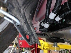 使用弹力带将右前轮毂内衬紧固到高压电池上。