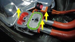 在高压电池仓处,使用 Hioki 电阻计测量充电接口母排引线与高压电池仓高压接头螺栓头之间的电阻。另请对其他引线和螺栓头执行该测试。
