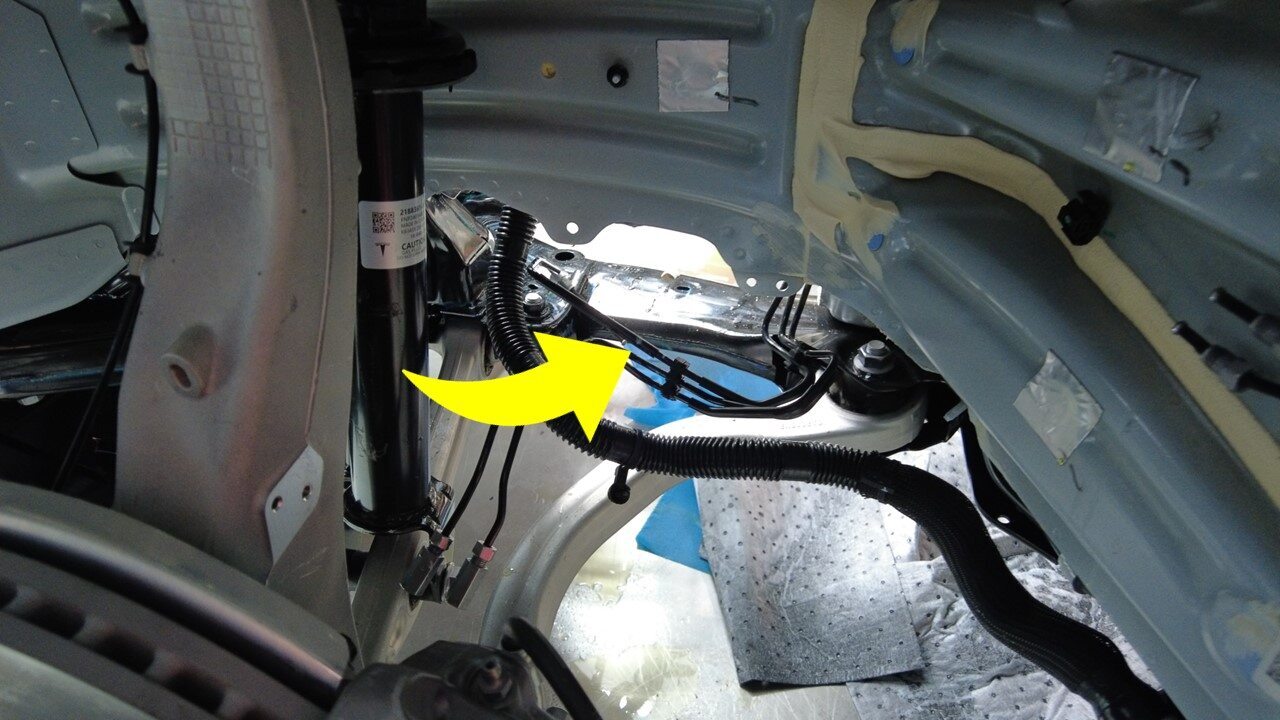 注先安装左侧制动管,然后旋转制动管路以安装右侧制动管。移动部分线束和冷却液软管,以留出足够空间。请勿弯曲制动管。