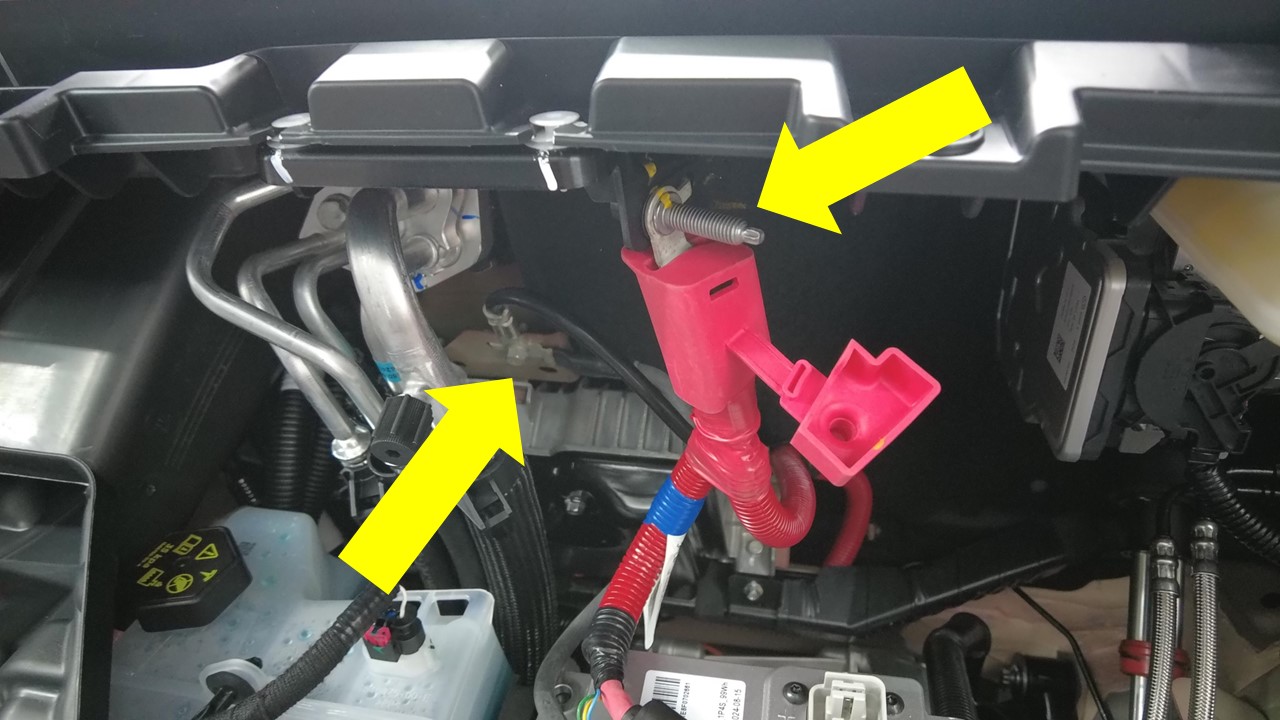 将低压维护设备负极端子紧固到位于车辆前车身控制器接地点上方的接地端子上。