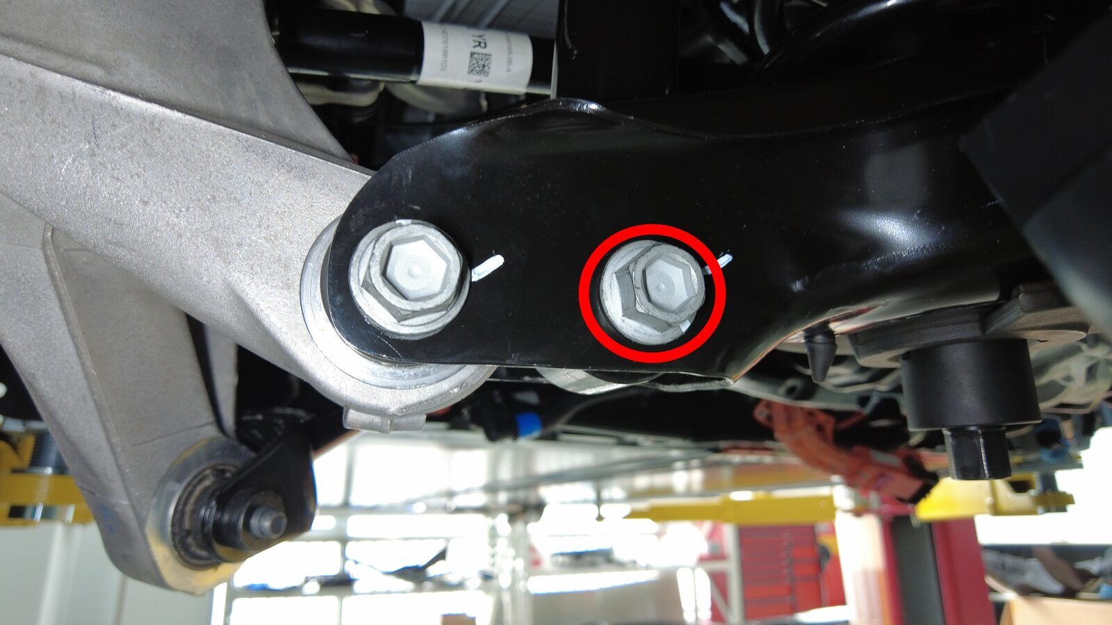 拆下将左后止推杆固定到副车架的螺母、垫片和螺栓