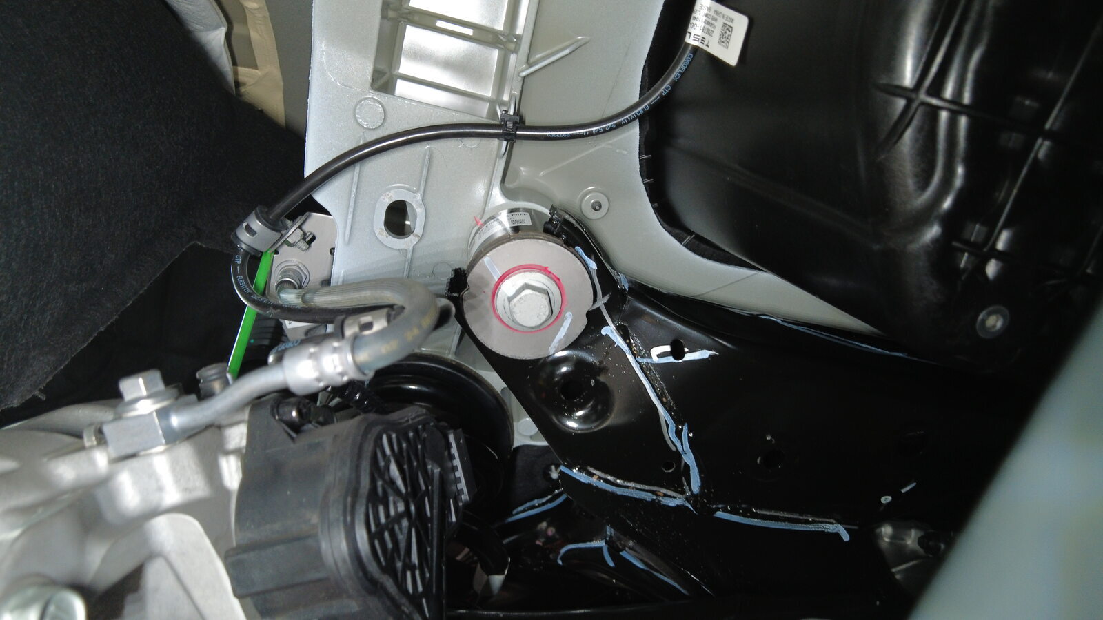 紧固将副车架和左侧剪力板固定到车身的螺栓
