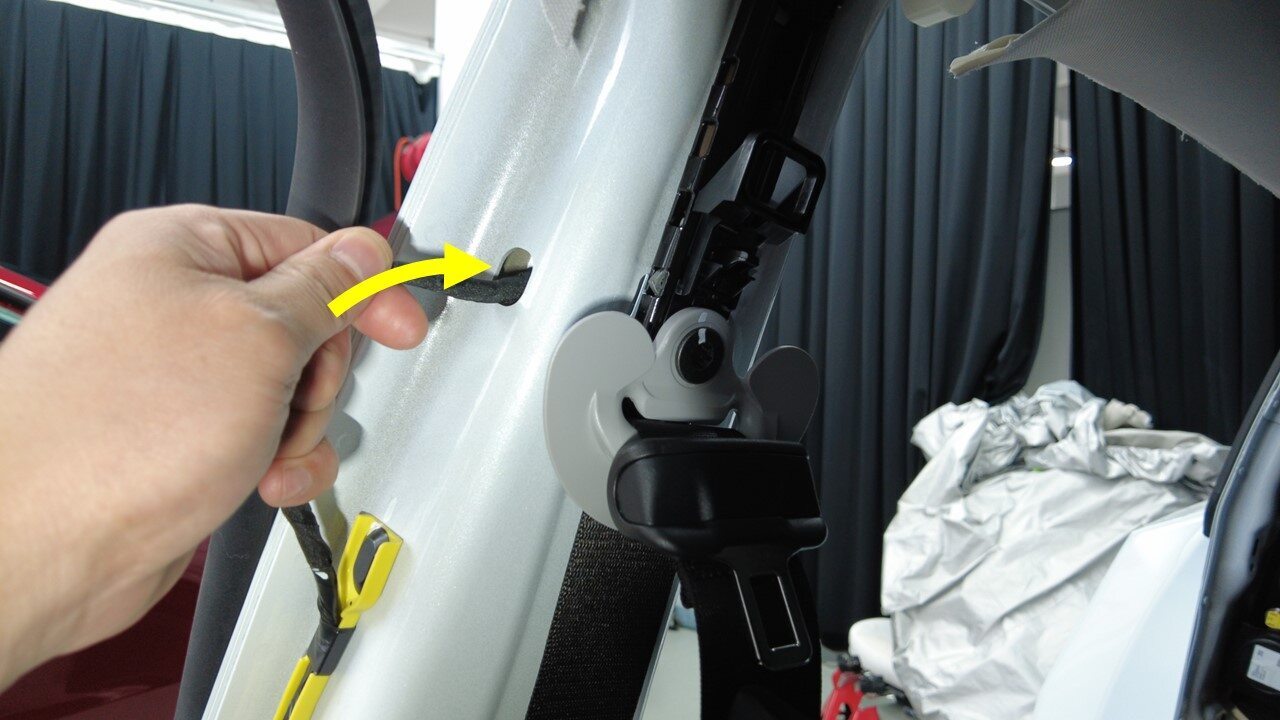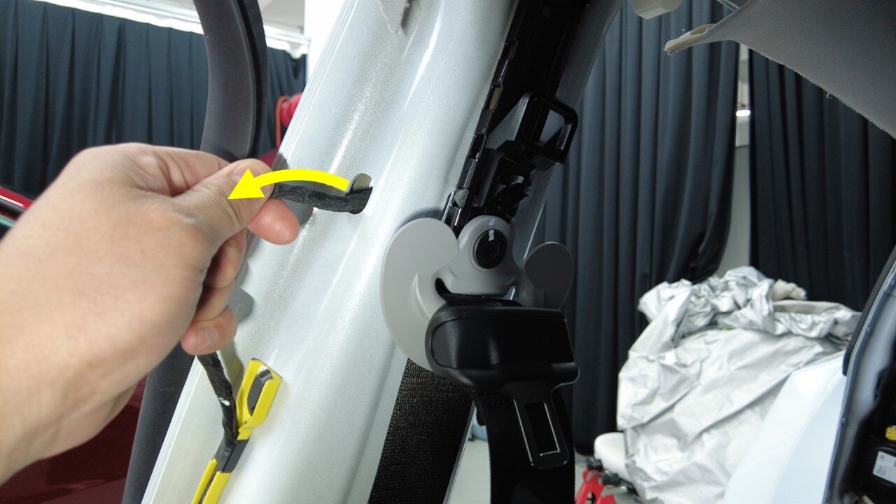 将右侧车身线束夹从右侧 B 柱区域松开。