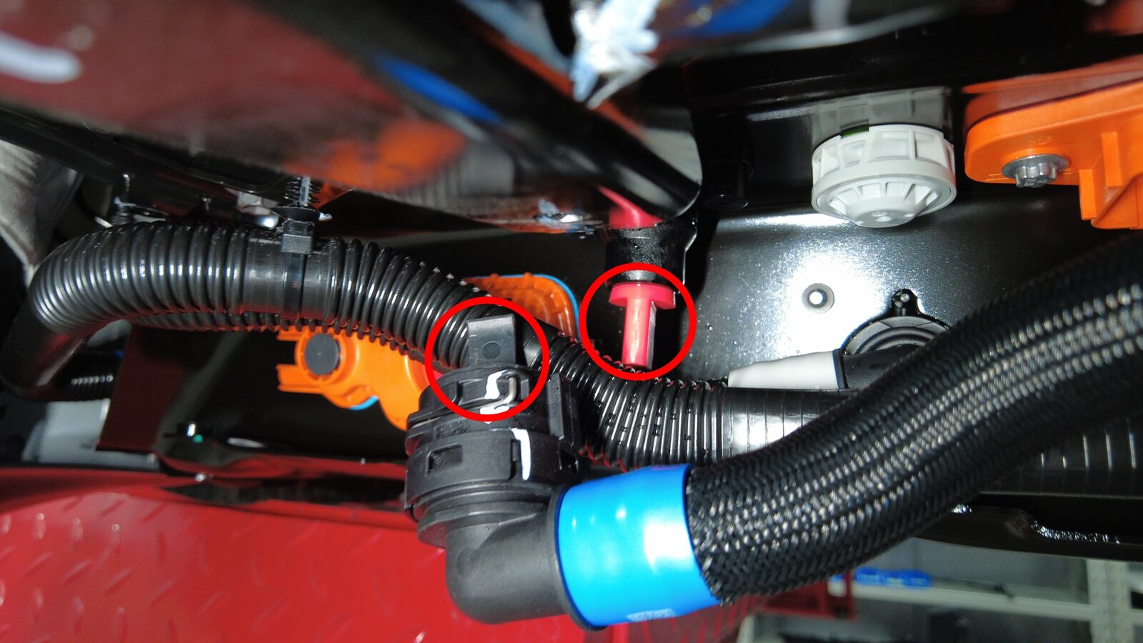 取下塞子,将后驱动单元变流器入口软管连接到高压电池后部。