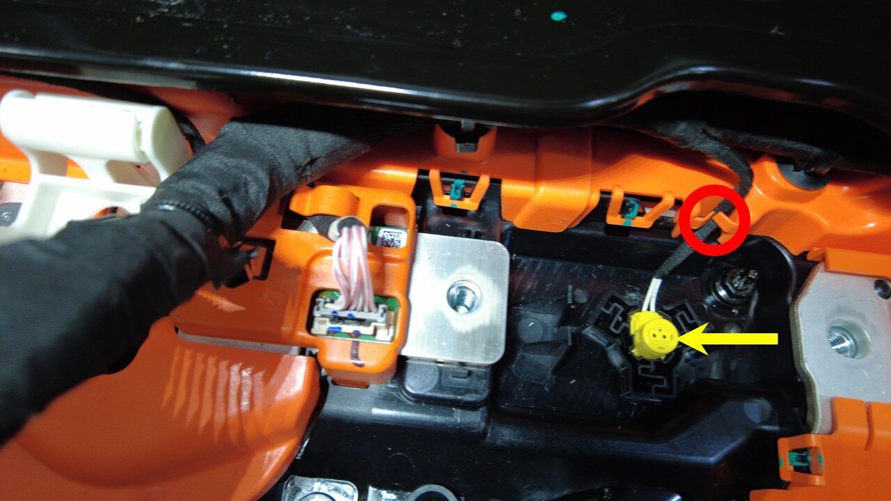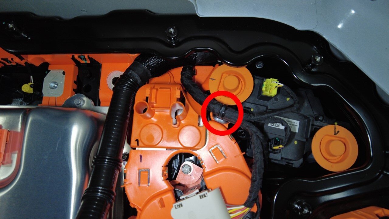 将高压电池仓线束夹安装到正极电池组触点开关上。