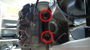 拆下并弃用将左前制动钳固定到左前转向节的螺栓(2 个),将制动钳从转向节上拆下,然后将制动钳挂在 S 型钩上。