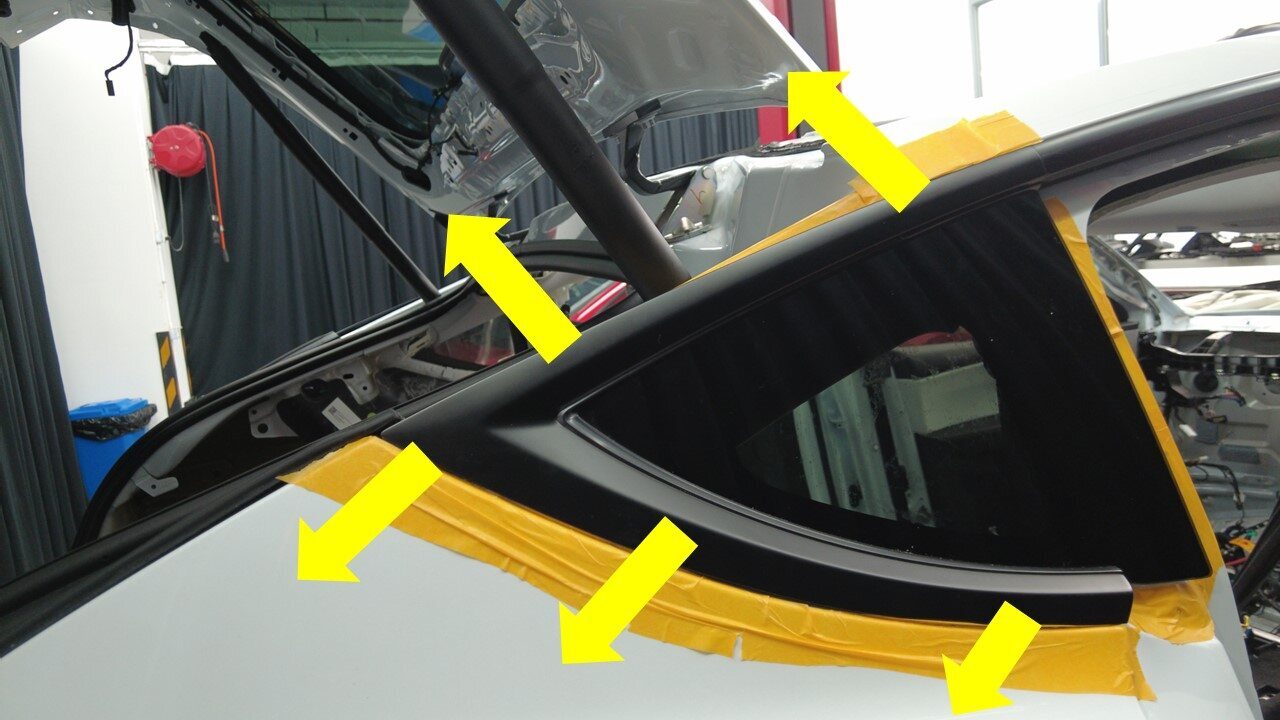 聚氨酯凝固期间,请使用胶带固定右后角窗玻璃。