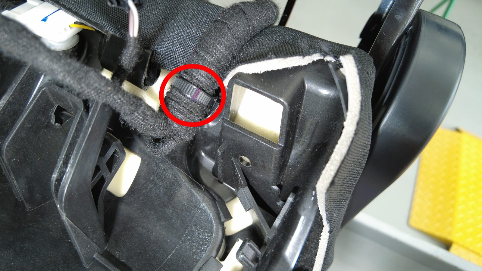 将左侧座椅线束安装到座椅靠背外壳上。