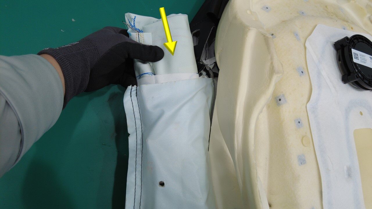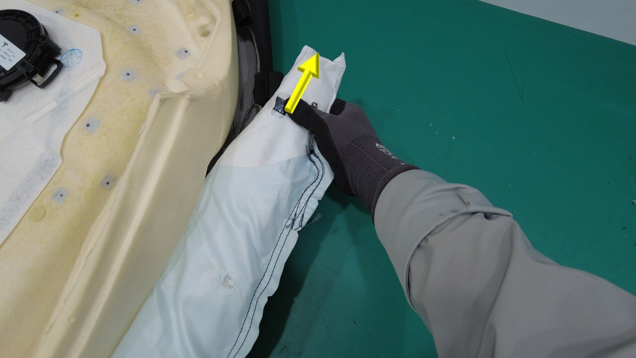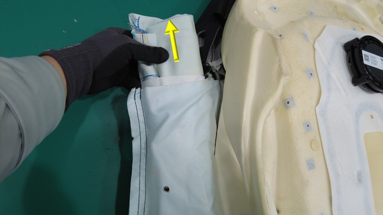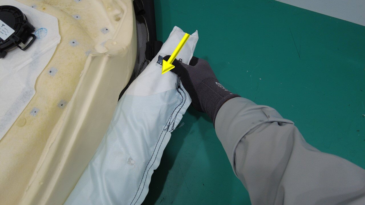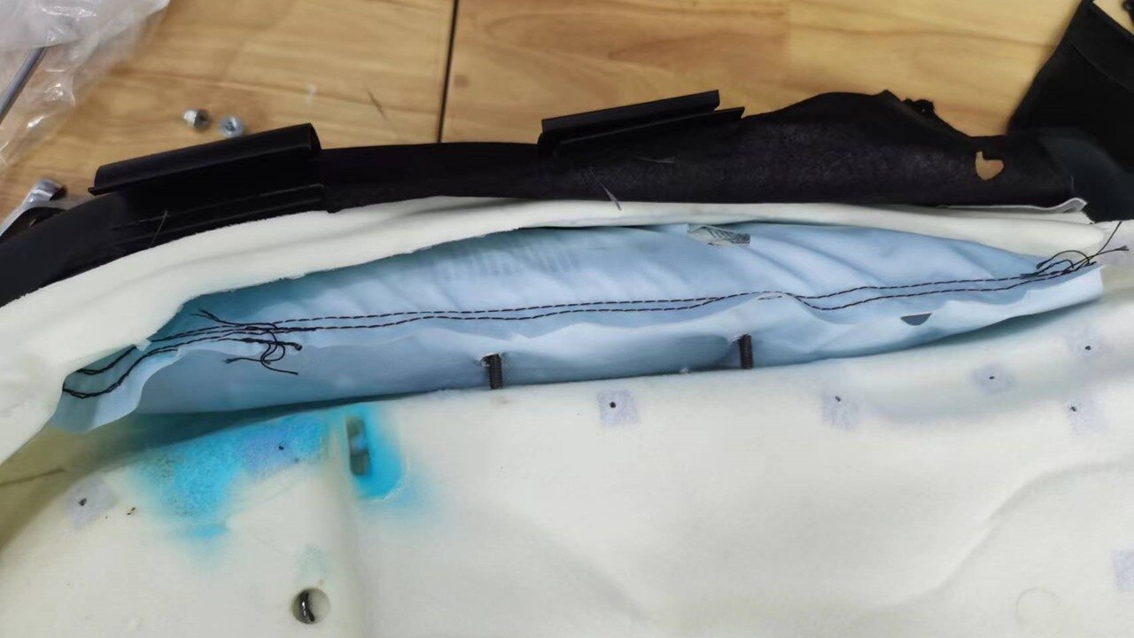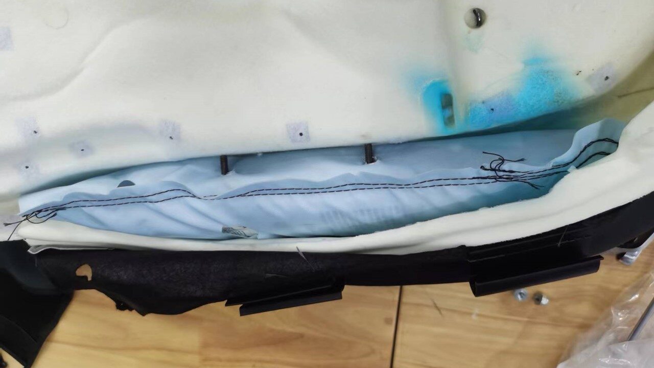 将驾驶位侧(外侧)气囊安装到气囊滑槽中,然后将气囊滑槽连同其内部的气囊一起插入座椅靠背泡沫上的凹槽中。
