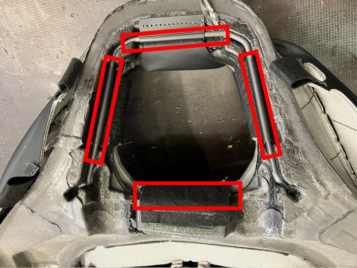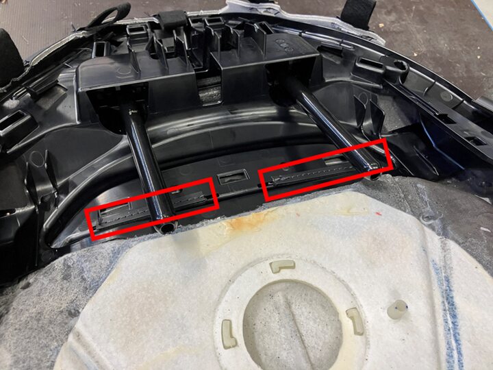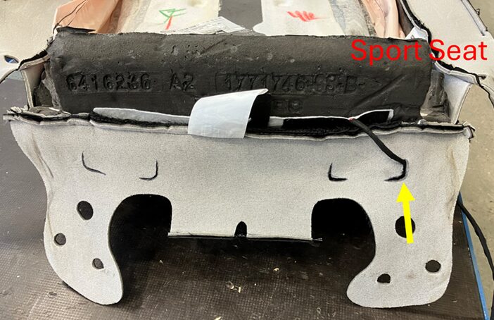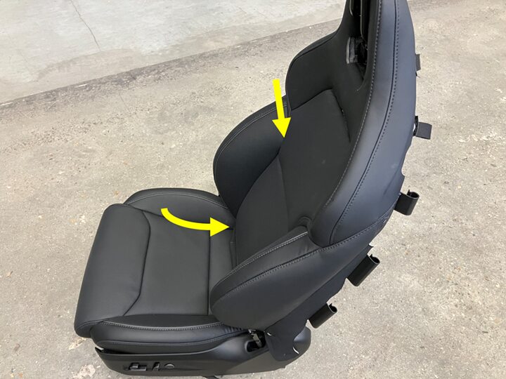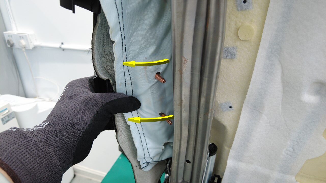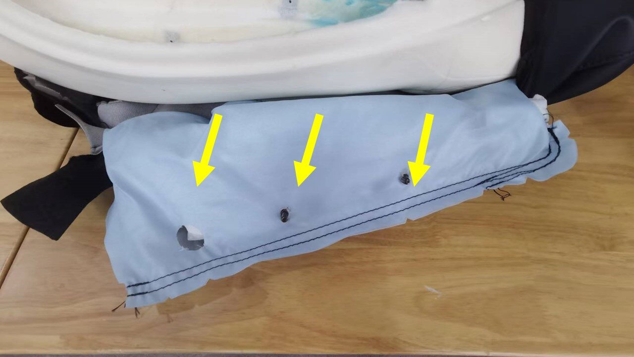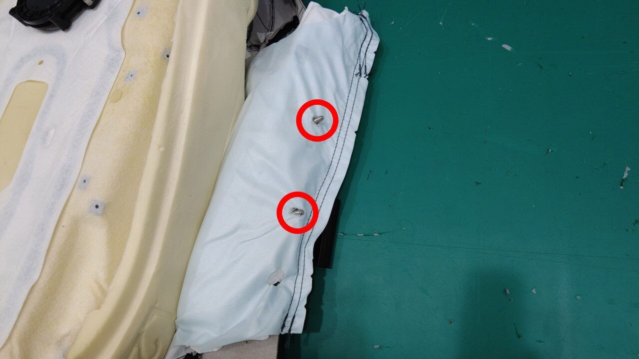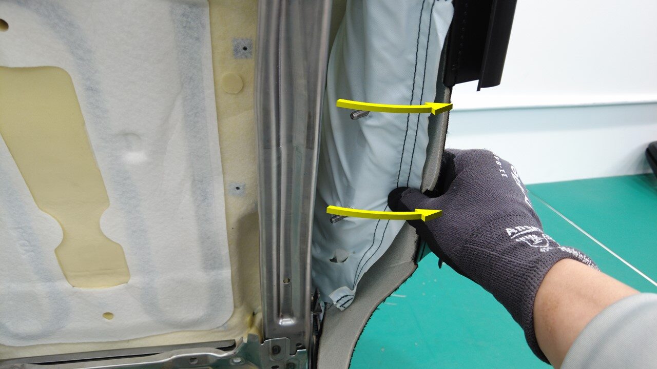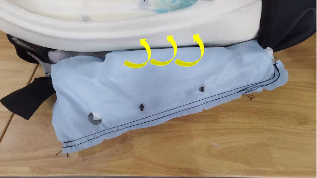 将驾驶位侧(外侧)气囊安装到气囊滑槽中,然后将气囊滑槽连同其内部的气囊一起插入座椅靠背泡沫上的凹槽中。