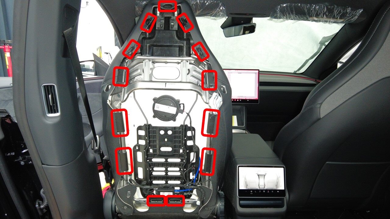 - 运动版座椅:将座椅靠背饰板固定件(13 个)安装到左前座椅靠背框架上。