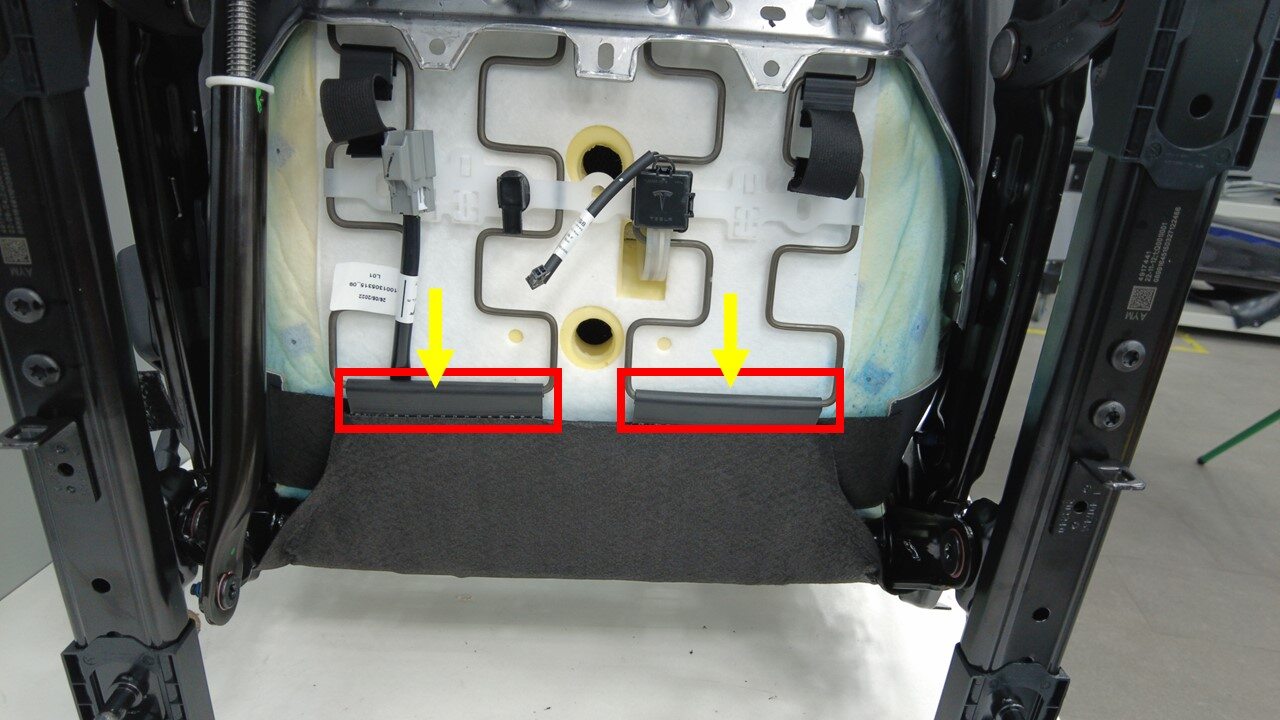 注2 个锁片。先将泡沫饰板径直滑动到座椅靠背框架上,注意确保头枕柱与座椅靠背泡沫接合。务必将与框架接合的加热器线束和下部饰板推入到框架背面。