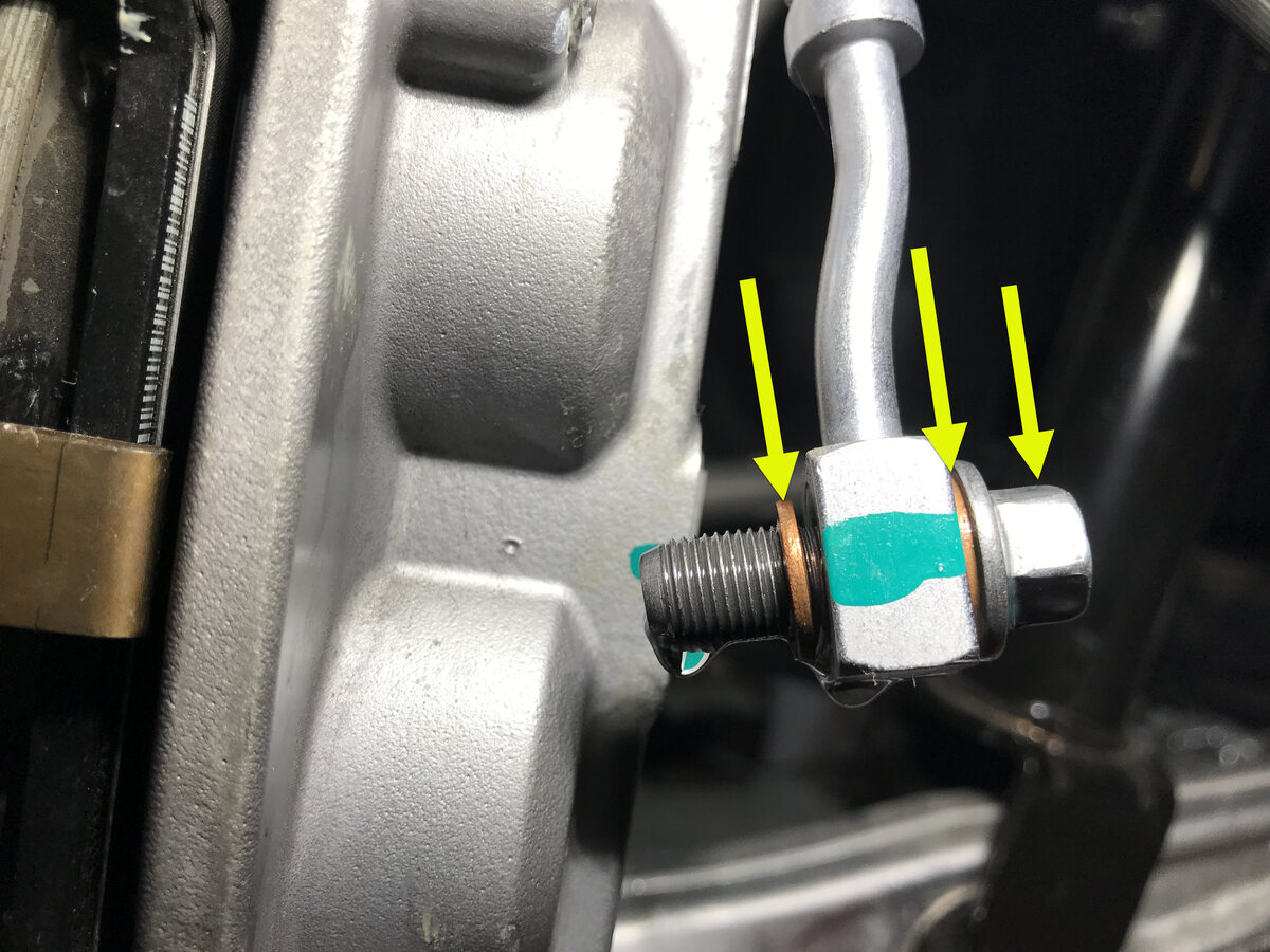 安装新的铜垫圈(2 个)和新的螺栓,将左前制动软管固定到左前制动钳。