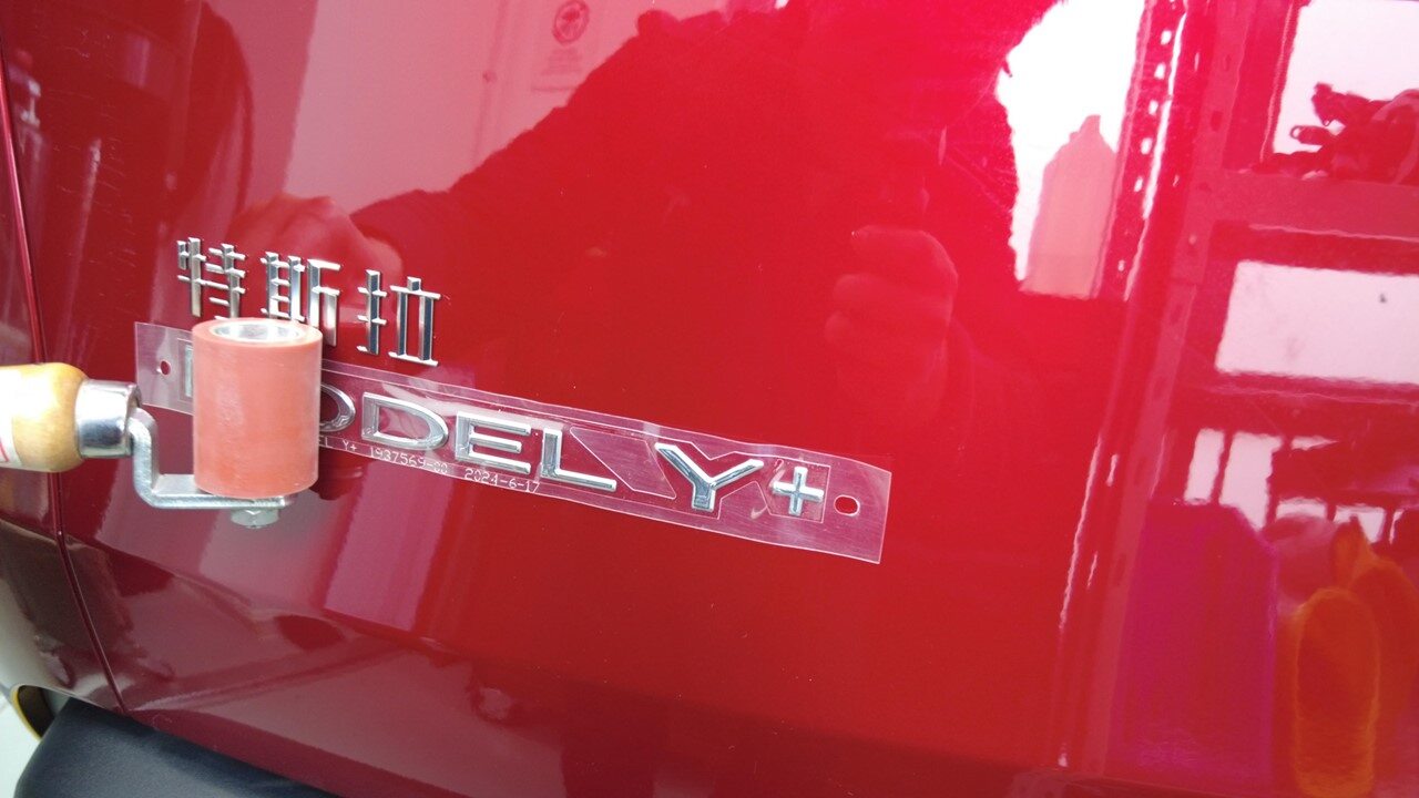 关闭掀背尾门,将保护膜重新置于徽标上,使用滚压机 (1049517-00-A) 彻底压实徽标,然后揭下保护膜。