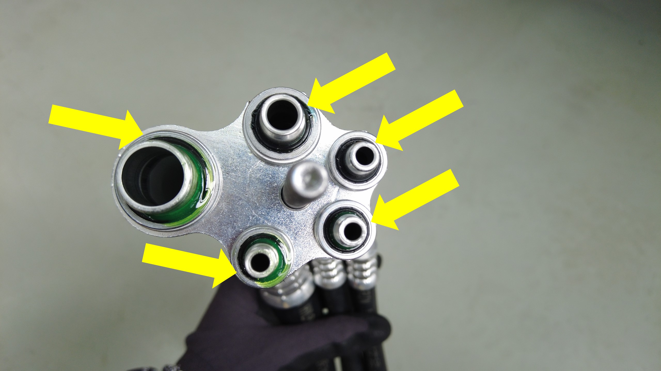 更换超级歧管至 HVAC 空调管路总成上超级歧管一侧的密封垫圈。