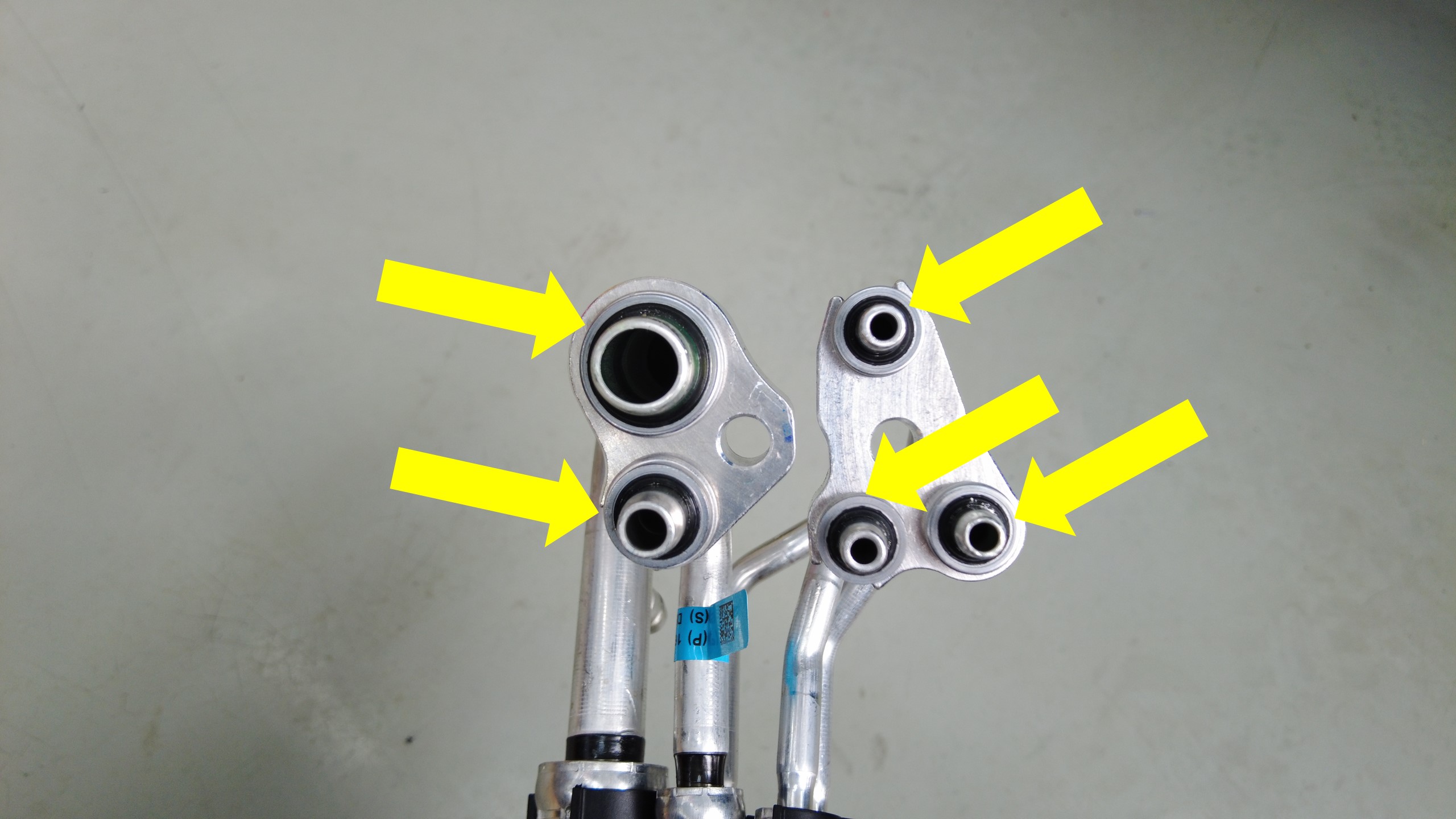 更换超级歧管至 HVAC 空调管路总成上 HVAC 空调侧的密封垫圈。