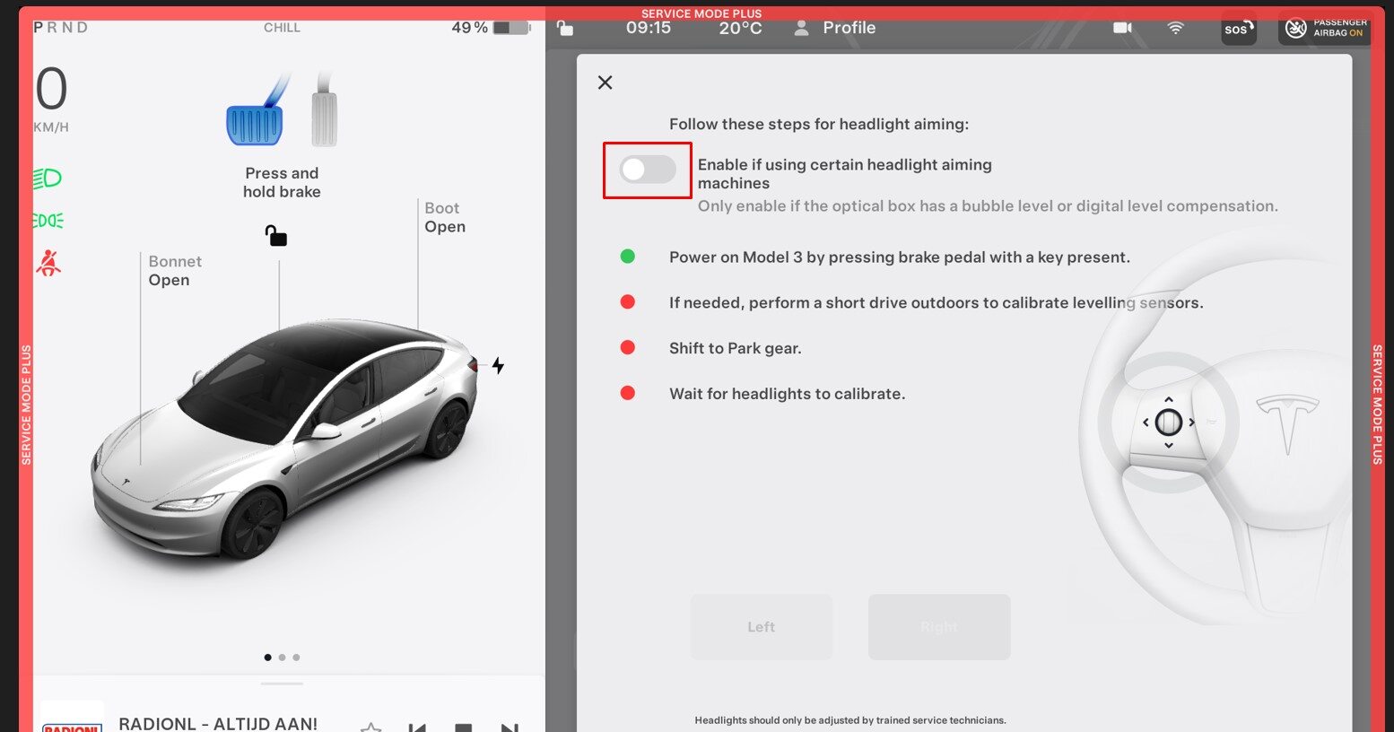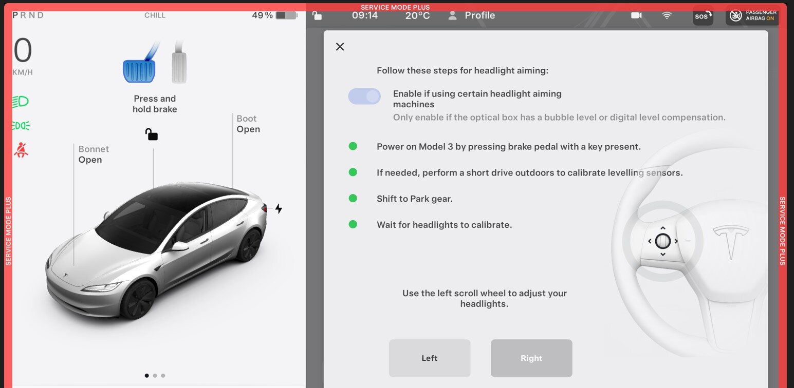 调整右侧前照灯:点击触摸屏上的Right,然后使用方向盘左滚轮调整光束水平。调整右侧前照灯,使水平光束顶部与墙壁上的水平胶带标记对齐,且 "L" 型光束的左边缘与左侧垂直参考胶带标记对齐。