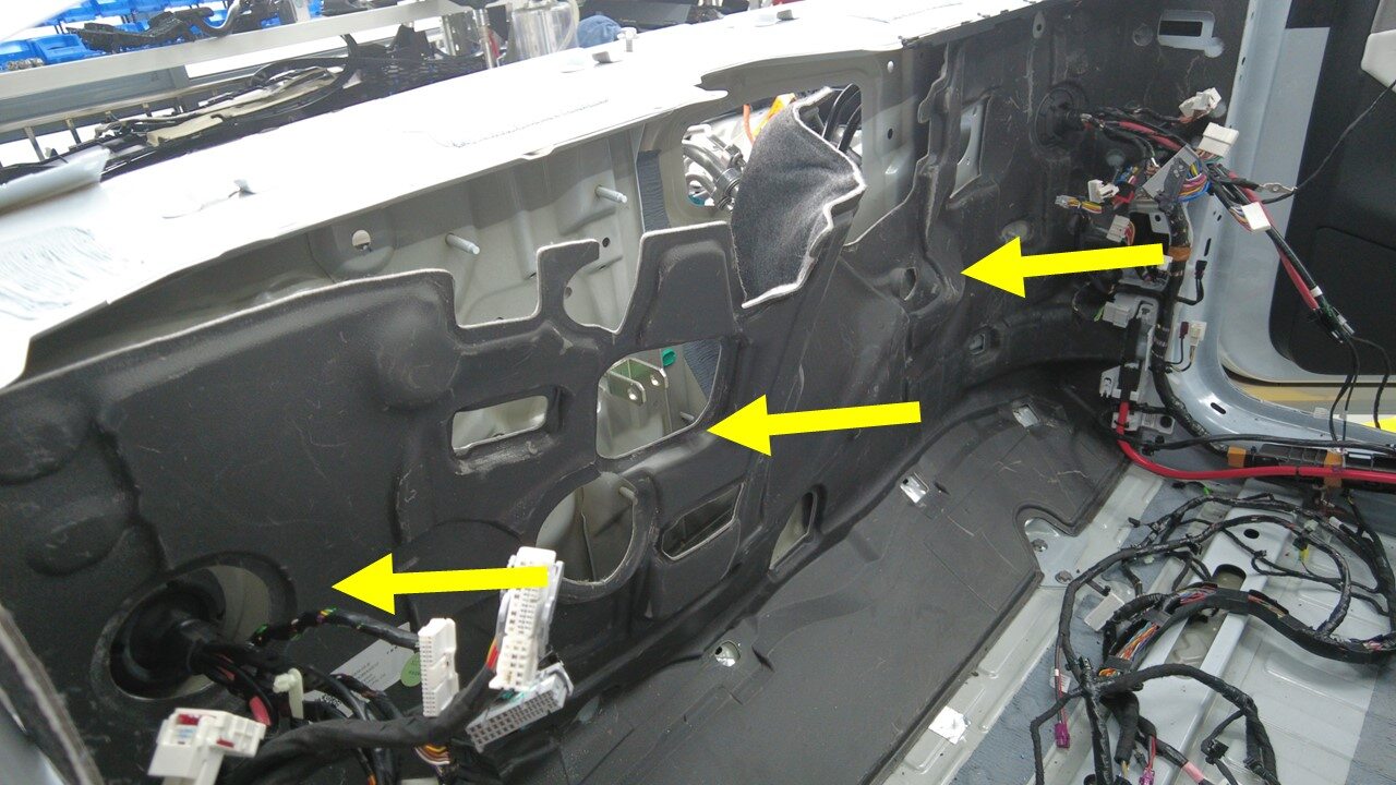 注请留意定位销(5 个)。松开前围板绝缘体两侧的前部车身线束。