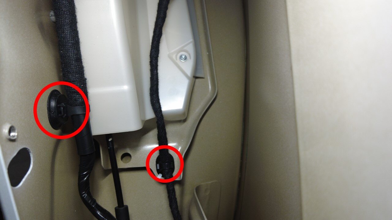 紧固将电气线束连接器固定到车门的卡子(2 个),直至听到清晰的锁止声,然后将索环放置到位。