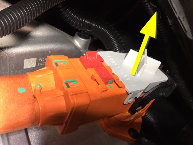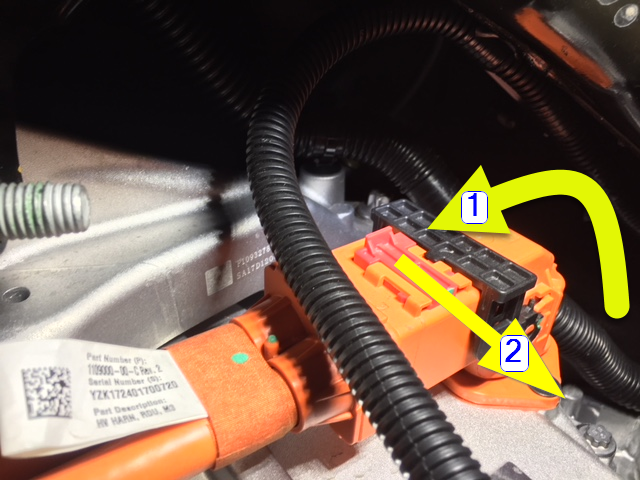 Schieben Sie die Entriegelung, um den HV-Steckverbindergriff der HV-Batterie für die Antriebseinheit hinten am Kabelbaum zwischen der hinteren Antriebseinheit und der HV-Batterie aus der gesicherten Position zu entriegeln.