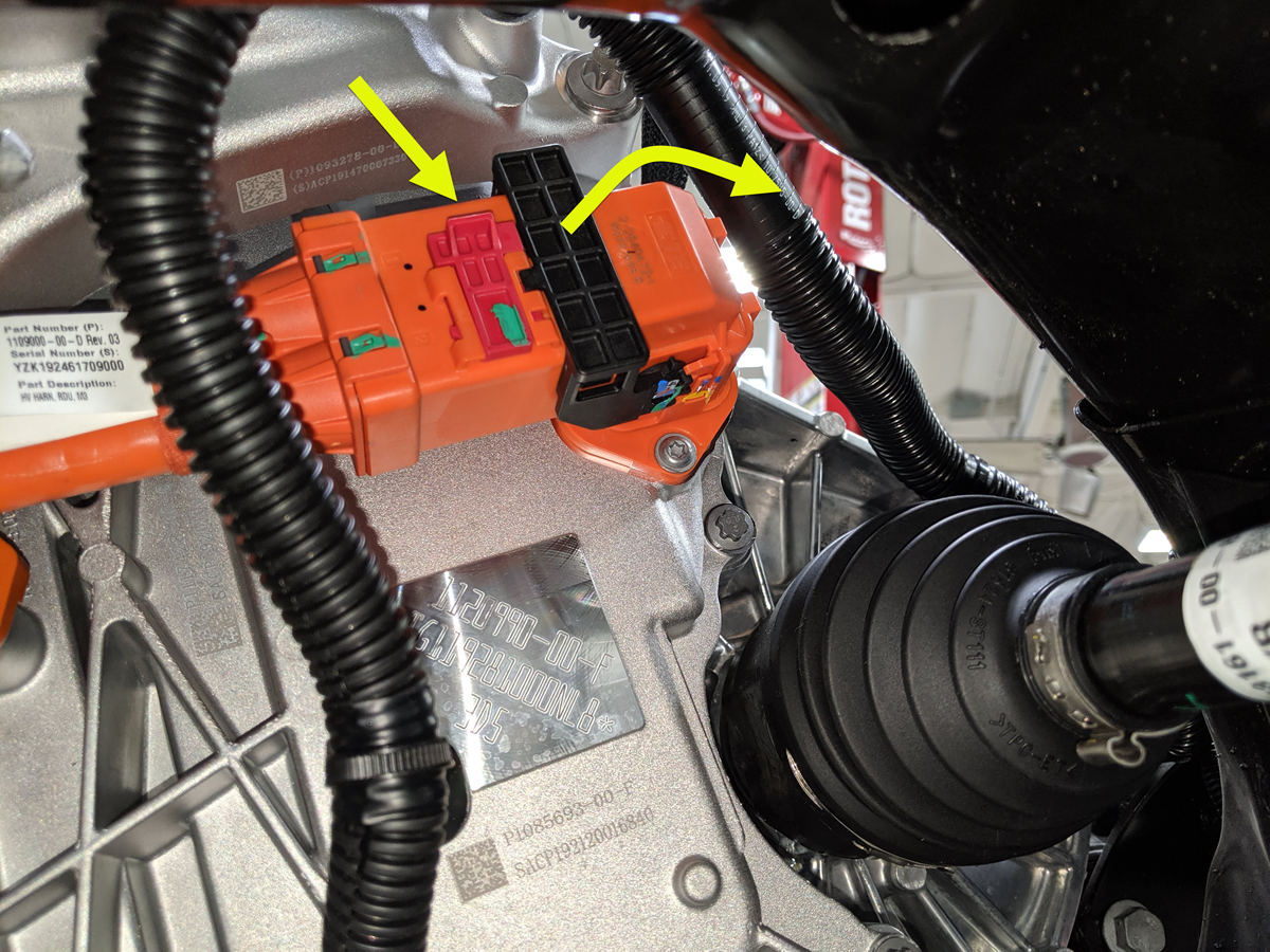 Schließen Sie das HV-Kabel der hinteren Antriebseinheit an der hinteren Antriebseinheit an.