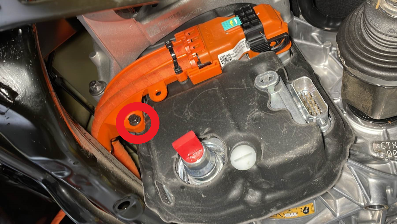 Entfernen Sie die Schraube, mit der die Halterung für das HV-Kabel der hinteren Antriebseinheit an der hinteren Antriebseinheit befestigt ist.