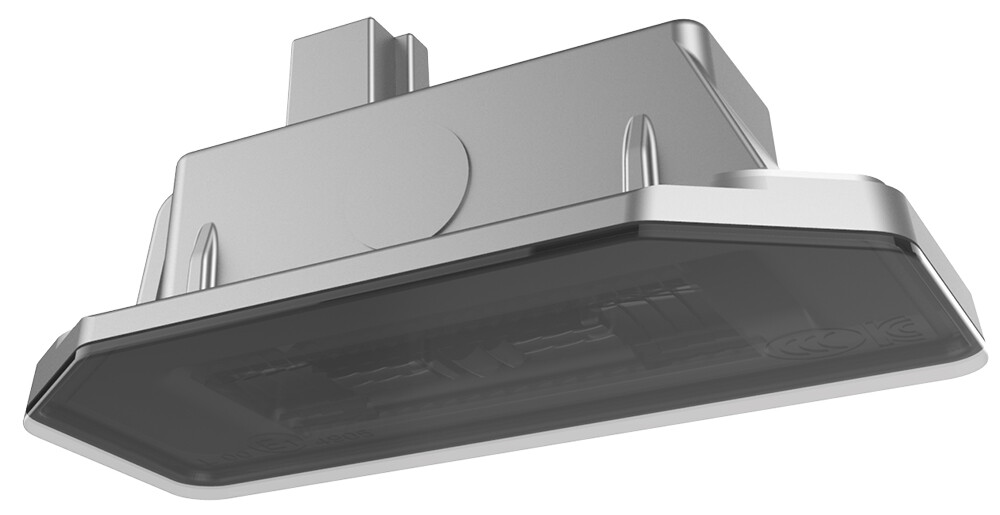 Push the license plate light towards the RH of the vehicle to compress the clip, and then compress the clip on the other side of the light to remove the light.