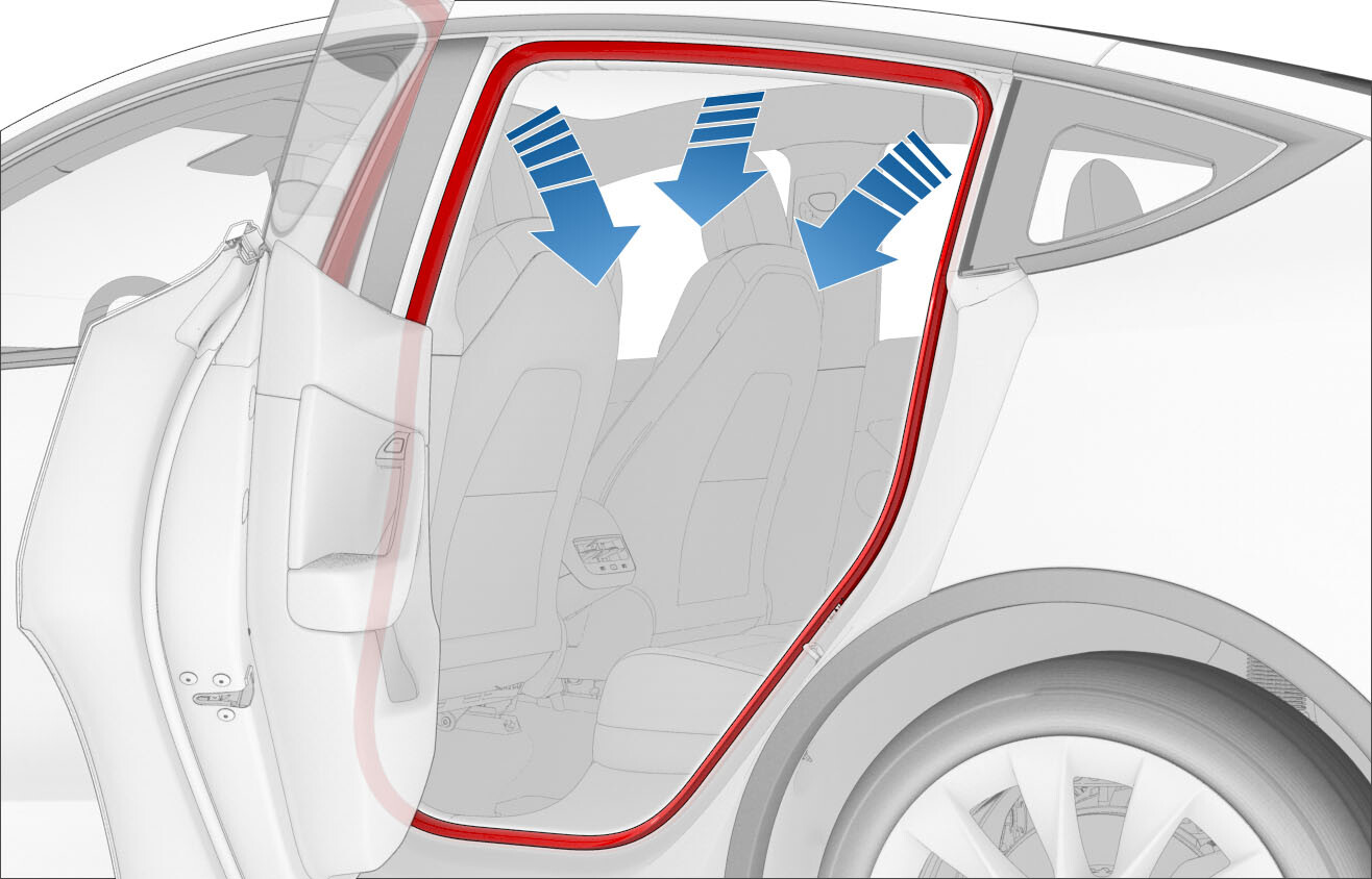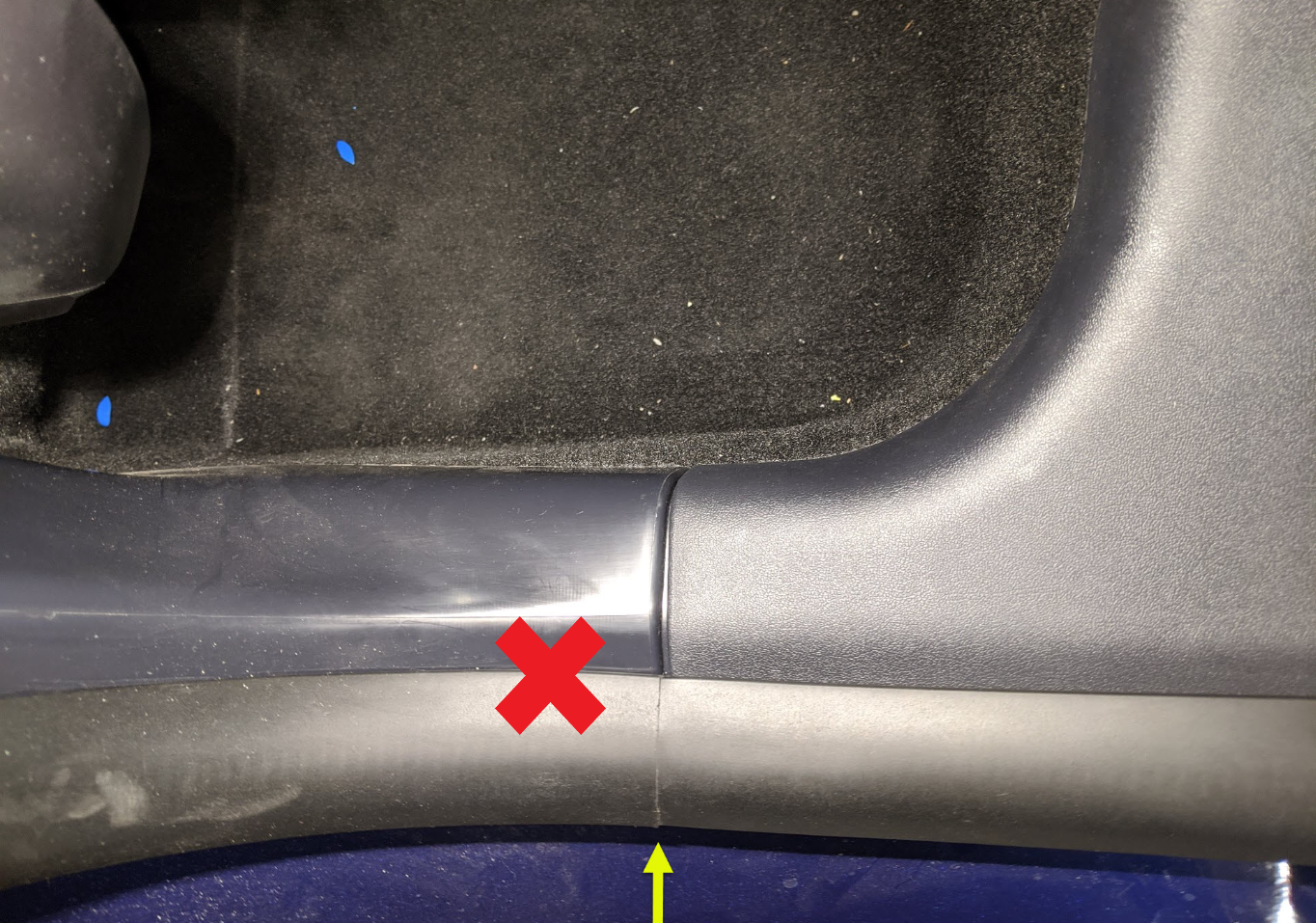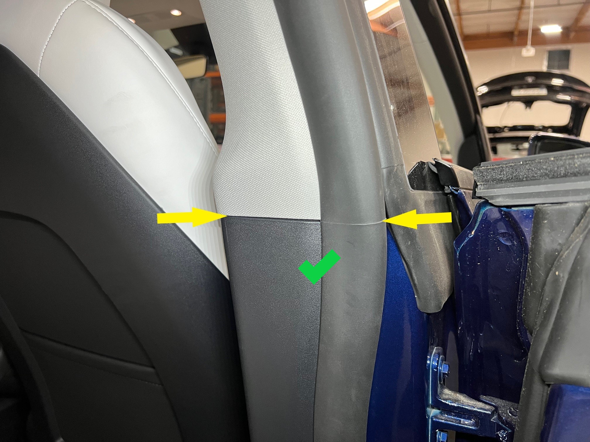 Figure 1. For vehicles built by Fremont and Austin, make sure the seam on the seal is even with the LH upper B-pillar. Figure 2. For vehicles built by Shanghai, make sure the seam on the seal is even with the bottom of the LH lower B-pillar. -