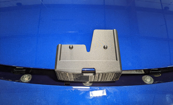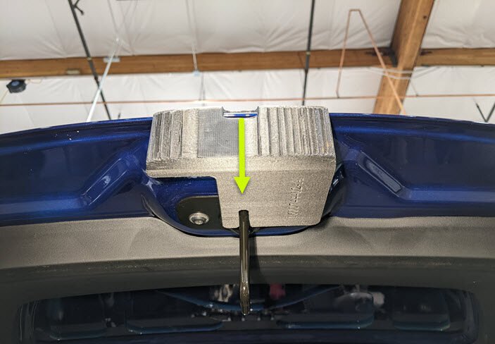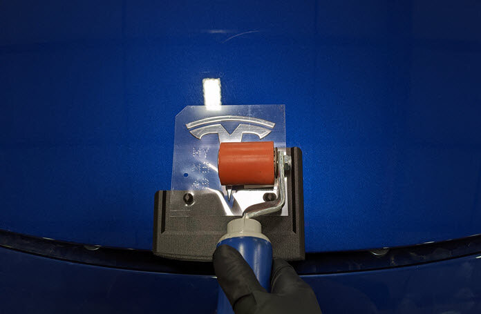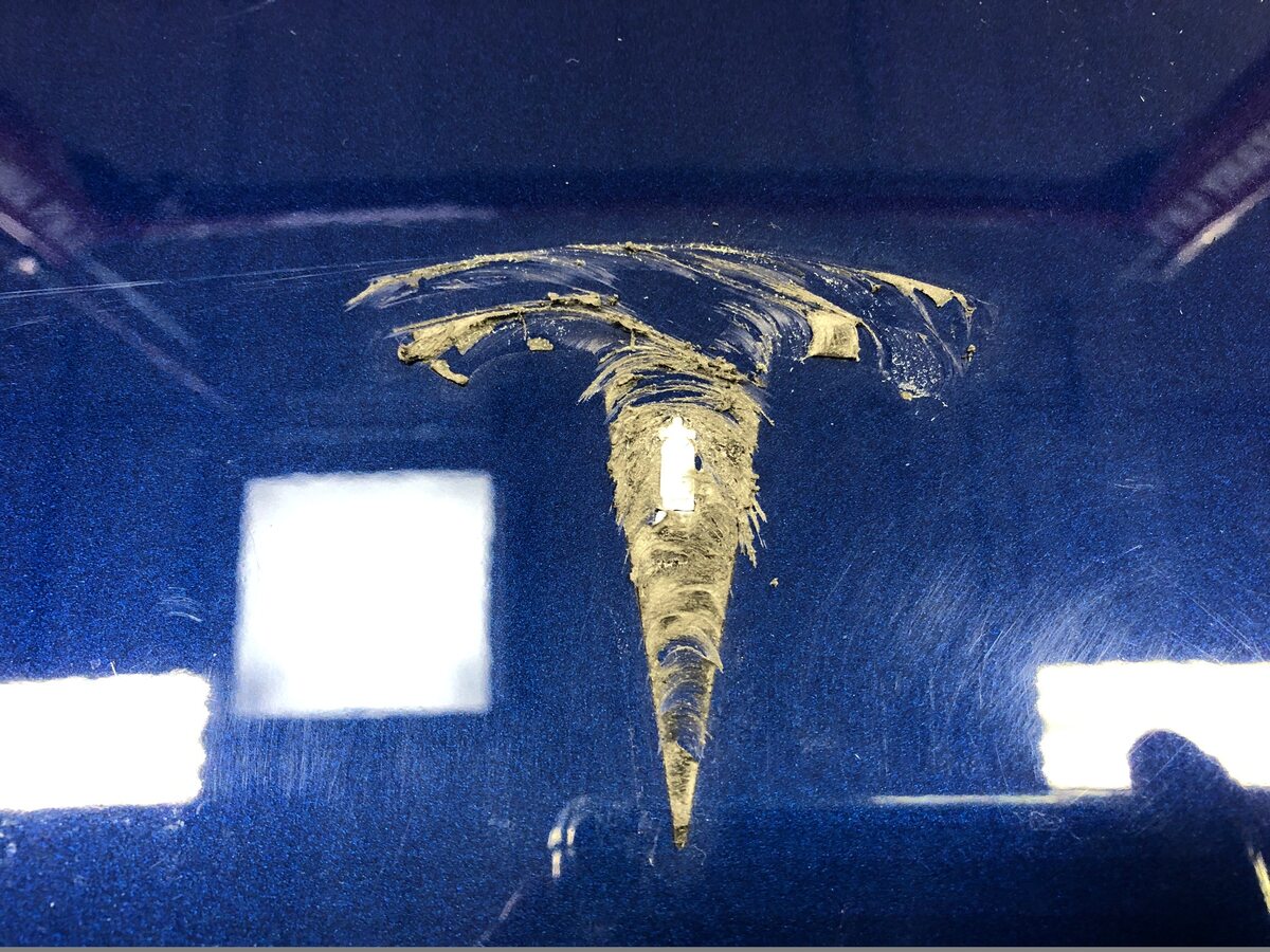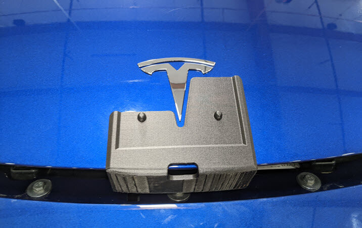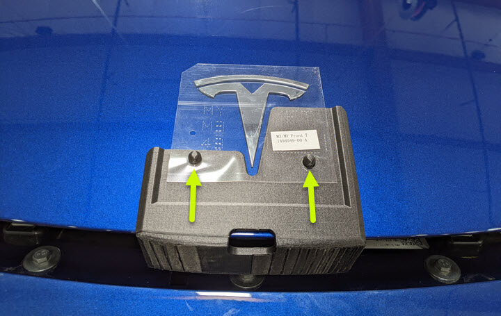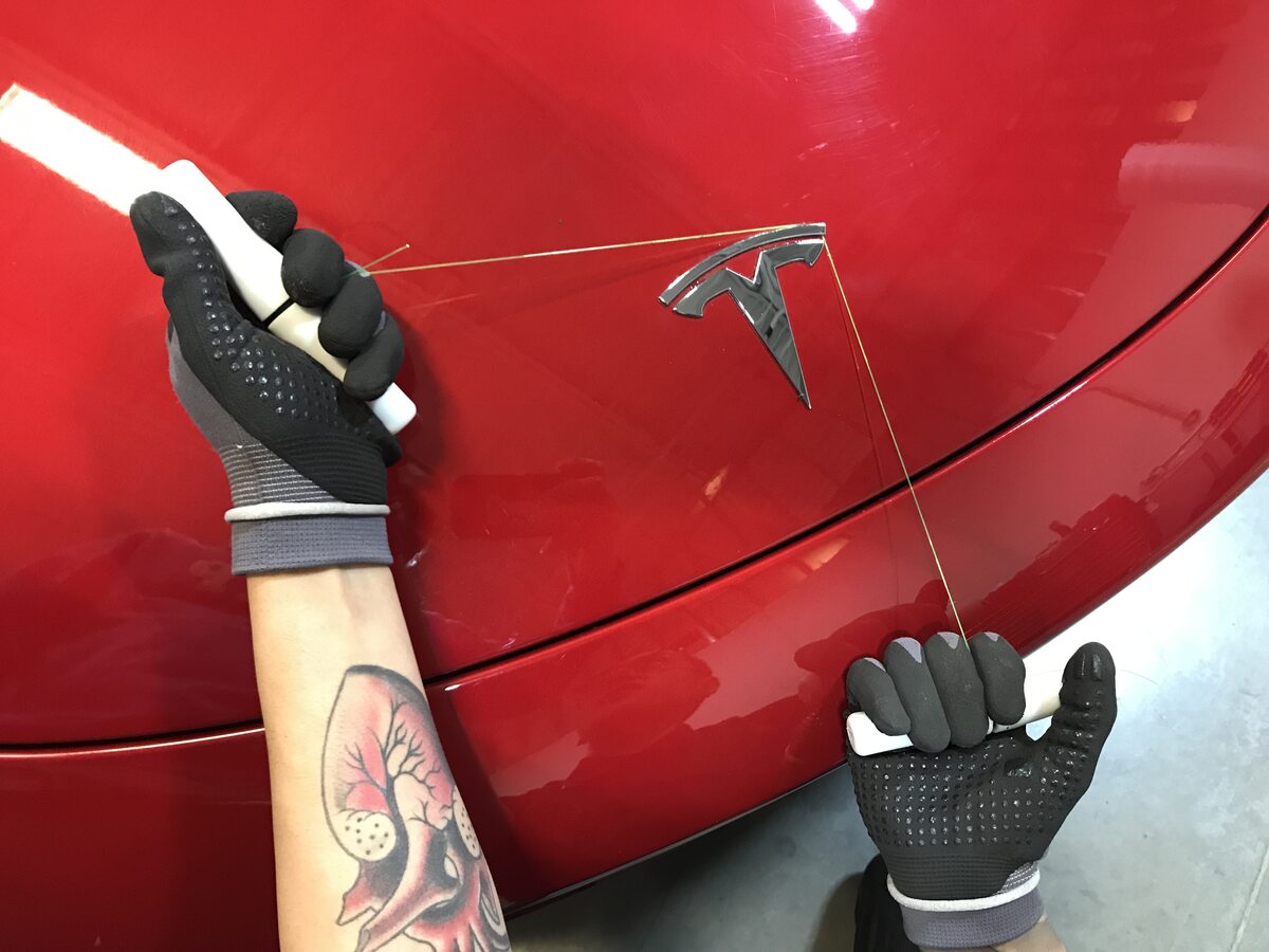 - With the hood closed, position the badge removal tool so that the monofilament line cuts under a corner of the front Tesla badge.