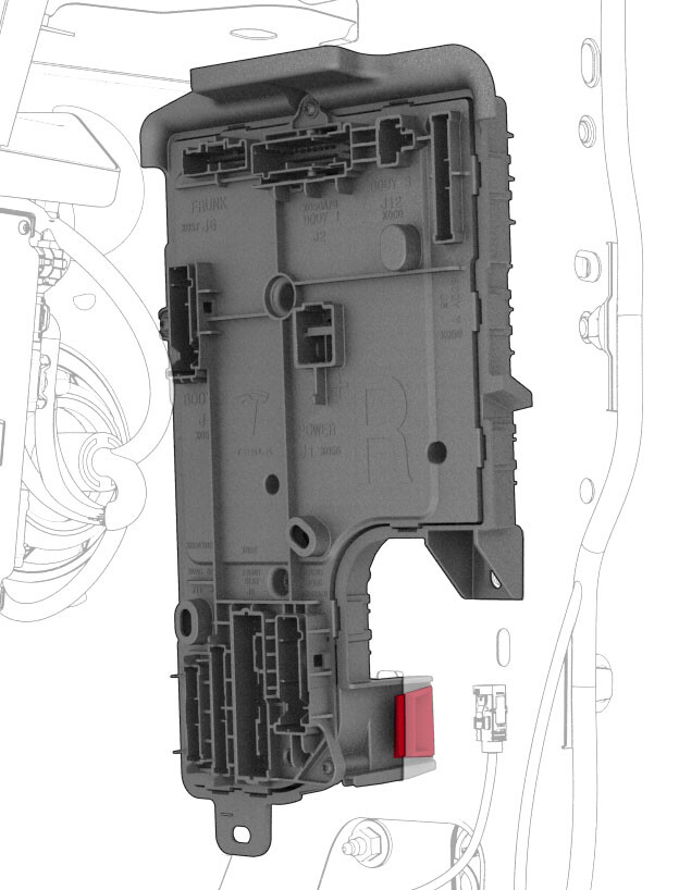 Connect the J1 power electrical connector to the RH body controller module, and then engage the connector lock.