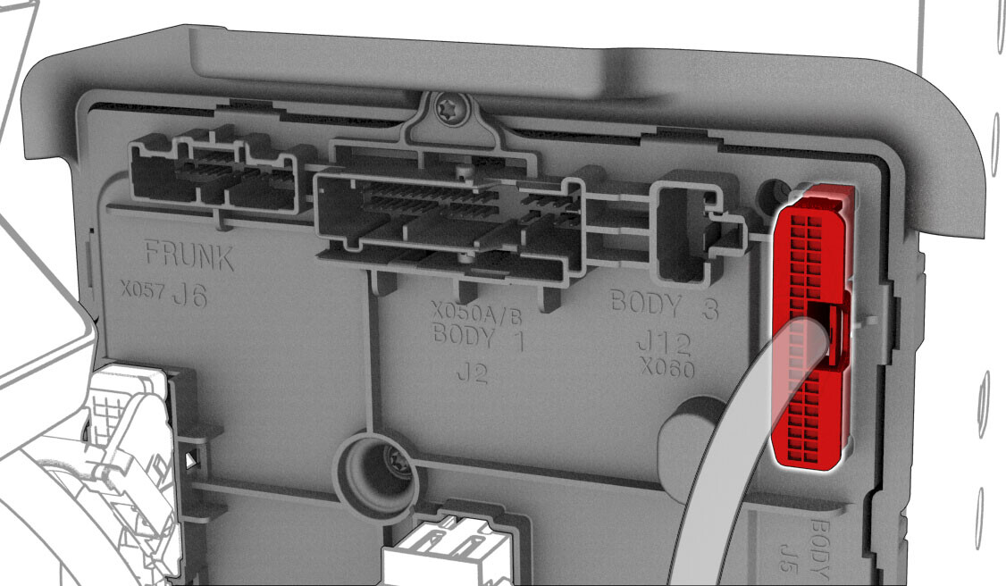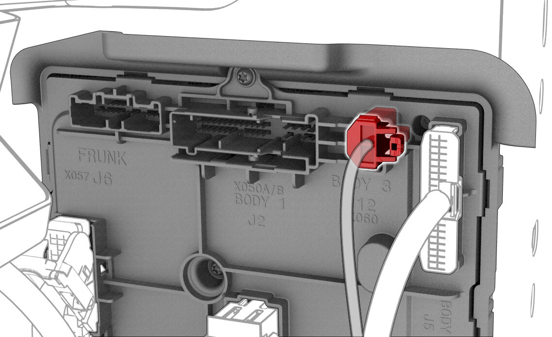 Connect the J2 body electrical connector to the RH body controller module, and then engage the connector lock.
