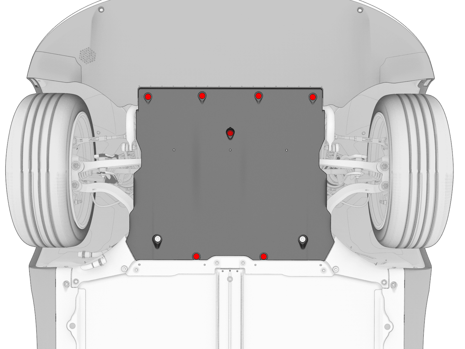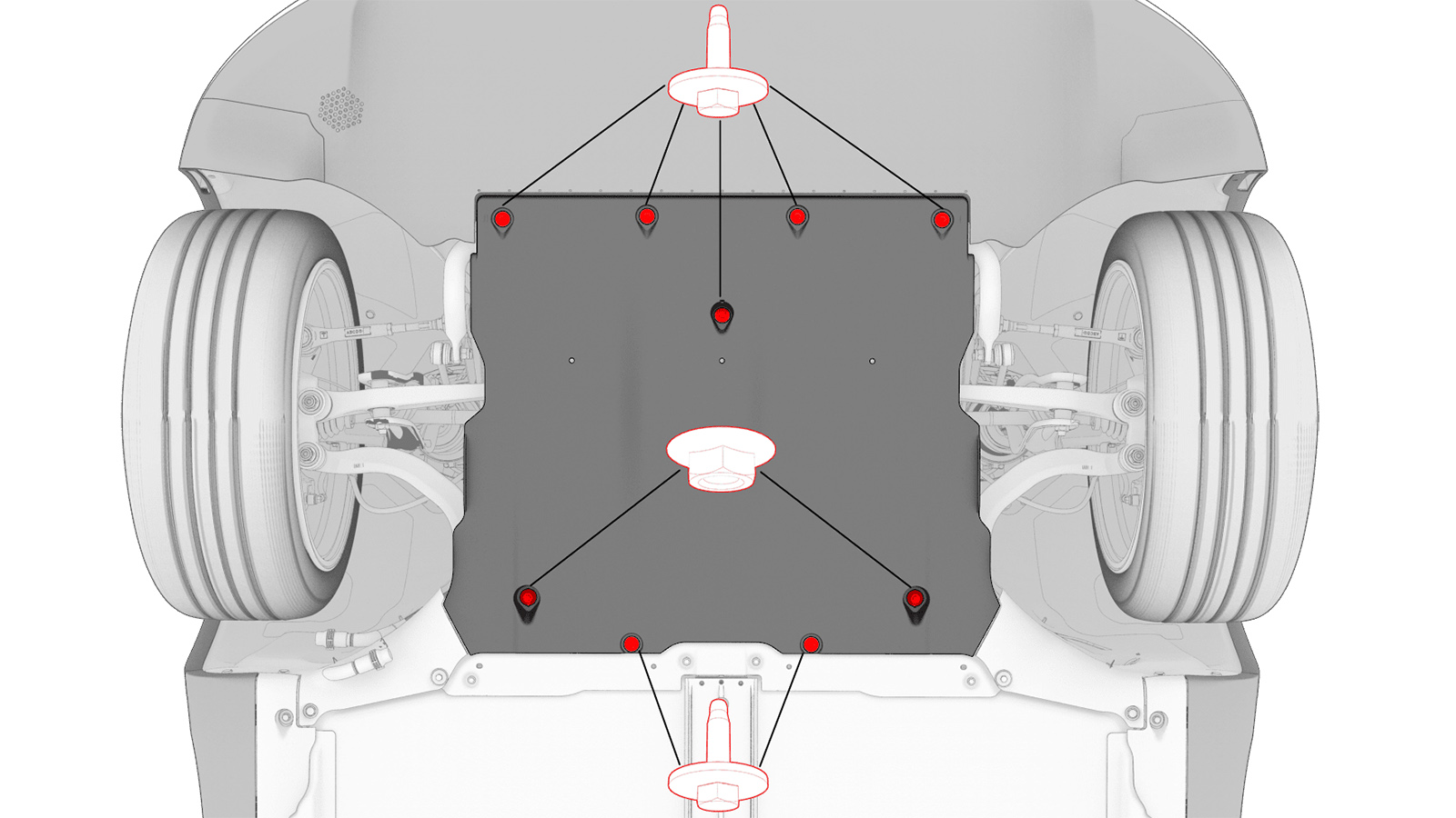 Install the front aero shield panel to the underside of the vehicle, and then hand-tighten the nuts (x2) to temporarily hold the panel in place.