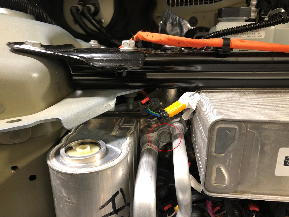 - Position the supermanifold to compressor A/C line onto the supermanifold, and then hand tighten the bolt that attaches the A/C line to the supermanifold.
