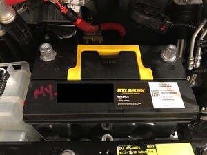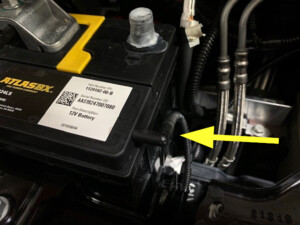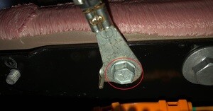 Remove bolt securing 12V battery upper tie down strap to AC compressor bracket