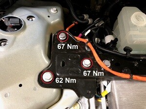 Note2x bolts, 15mm, 67 Nm, 1x bolt, 15mm, 62 Nm, See image for torque location