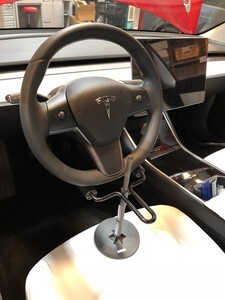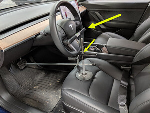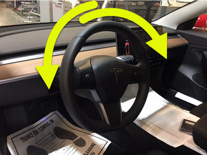 Unlatch the driver door, place vehicle in park and remove steering wheel leveler and steering wheel holder