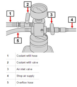 Slowly open the coolant refill valve to allow coolant to be drawn into the coolant refill hose, Close the valve when the hose is full of coolant