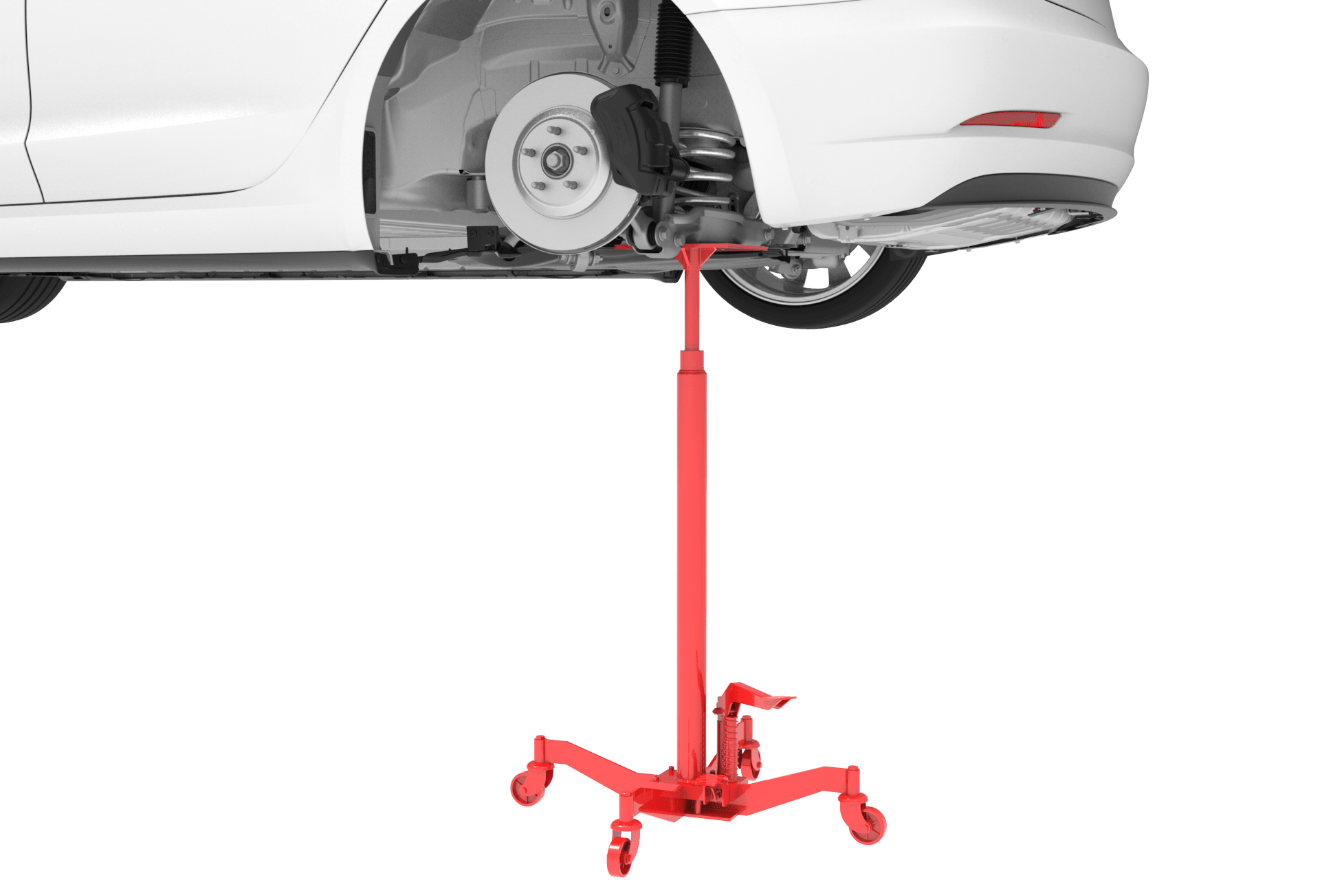 - With assistance, hold the LH rear suspension spring while slowly lowering the support stand to release the LH rear lower aft link from the knuckle.