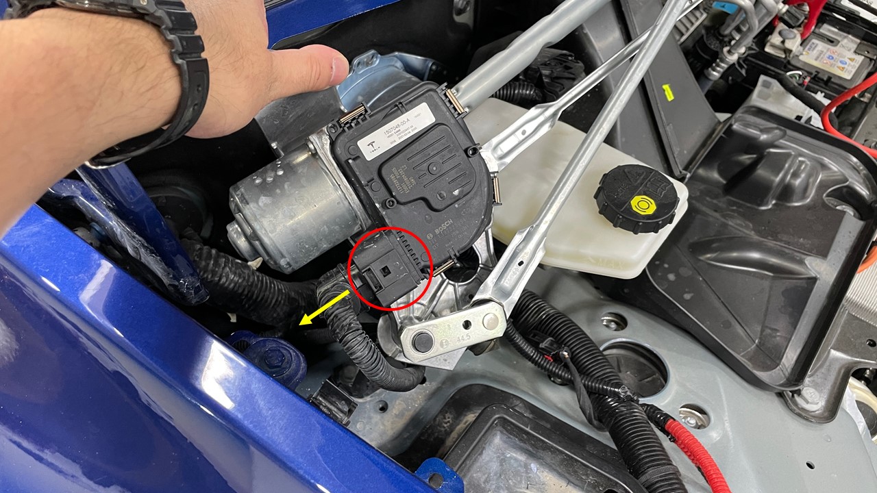 With the wiper module facing upside down, connect the electrical connector. Afterwards, rotate the wiper module towards the rear of the vehicle to ensure proper harness clearance.