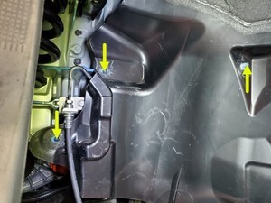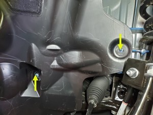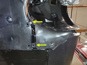 Remove the rocker bolt and aero shield bolts (x2) that attach the LH front wheel arch liner to the HV battery.