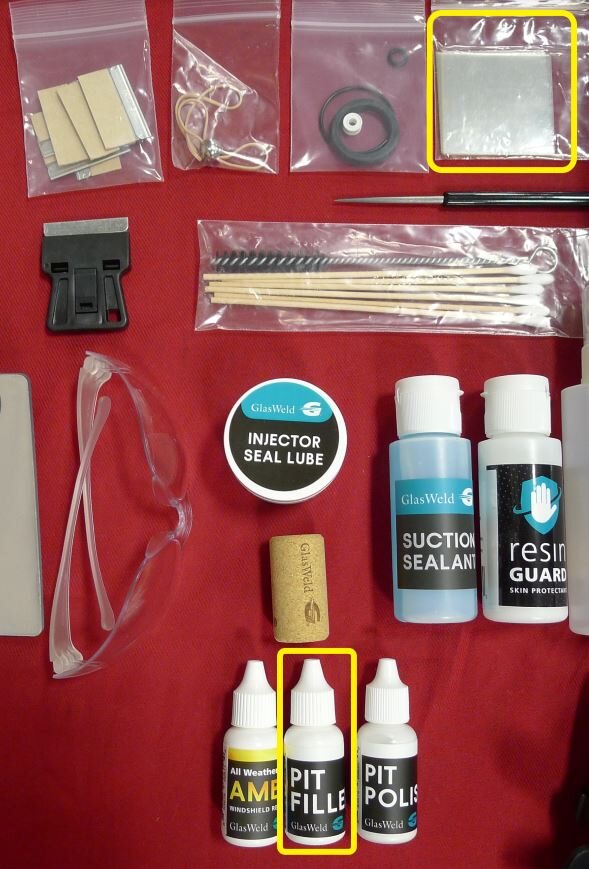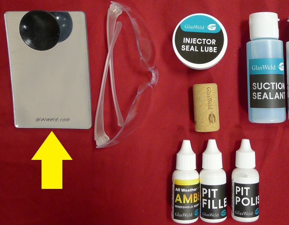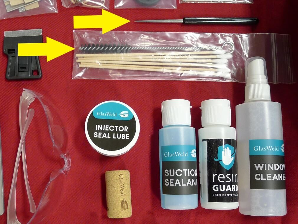 Inspect the glass crack repair kit, ensure all tools are present and resin residue is not present, and then inspect the seals for cracks, wear or swelling.