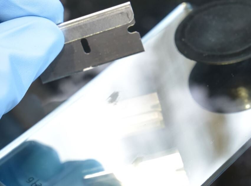 NoteHold the blade at a 90 degree angle and scrape until the resin is level with the glass surface.