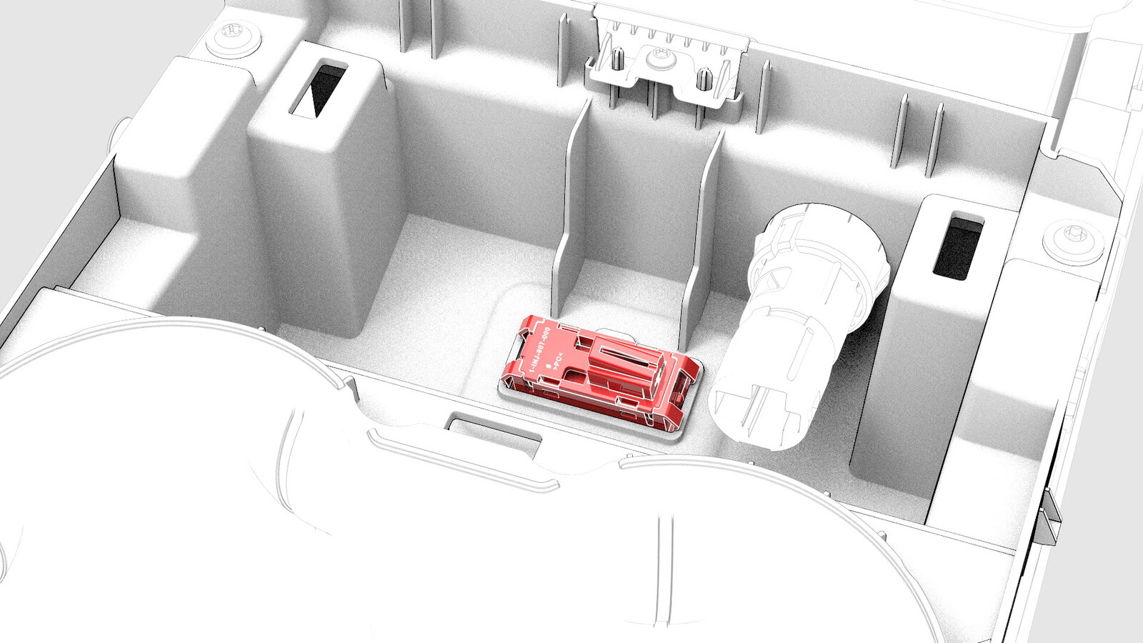 Release the small tabs on the spring cap and slide the power socket inside the cap, so that the openings in the side of the socket align with the large tabs of the cap.