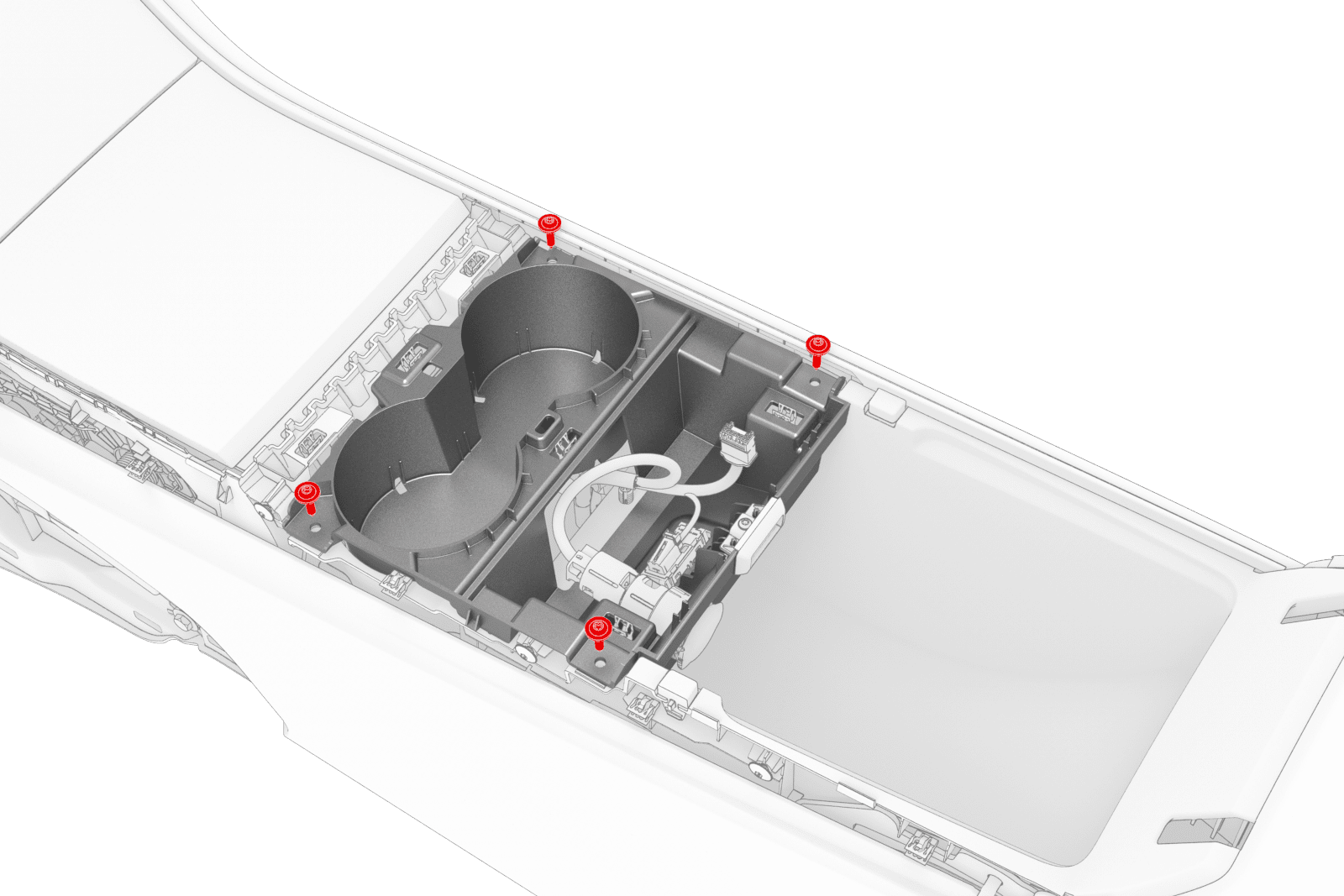 | Screws that attach the cup holder lower assembly to the center console |