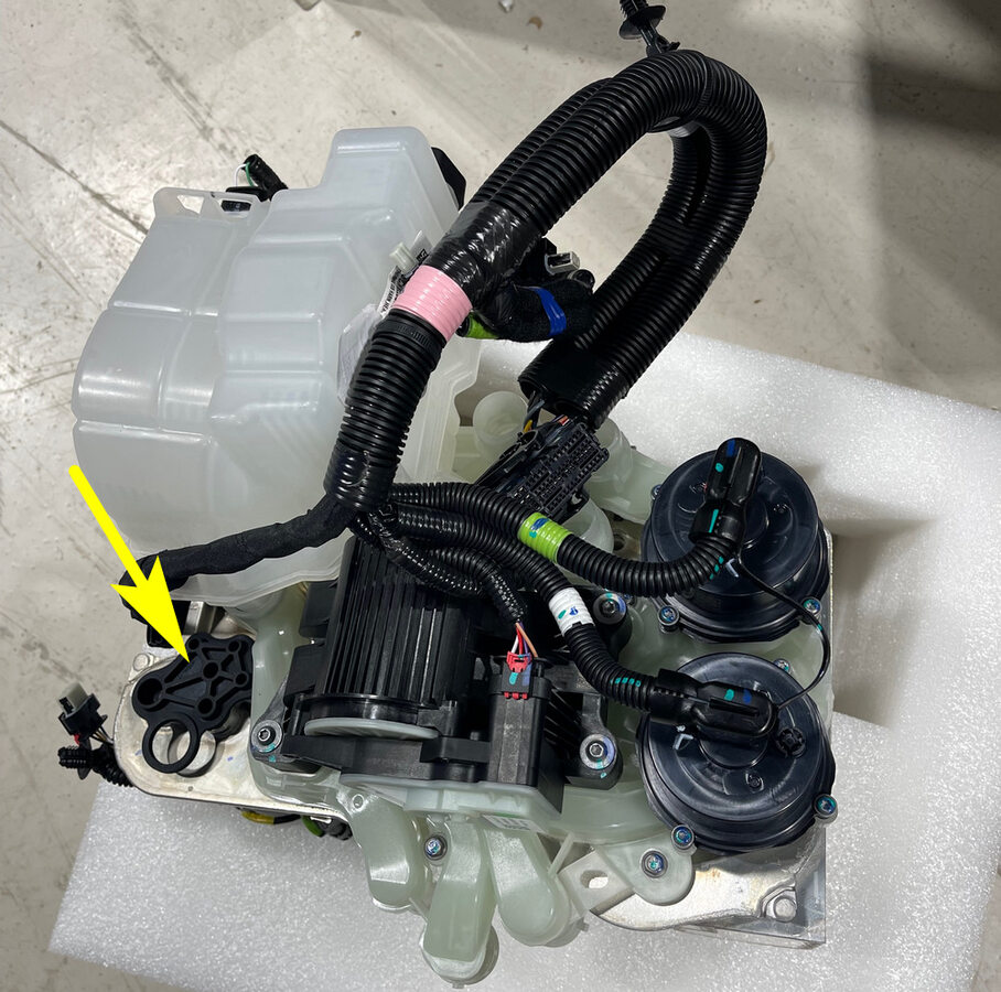 NoteIf the vehicle is equipped with an earlier model temperature sensor (left image), the new super manifold connectors may not fit. In this case the electrical connector cover must be swapped from the old supermanifold to the new supermanifold. Perform Rework Connectors before installation.