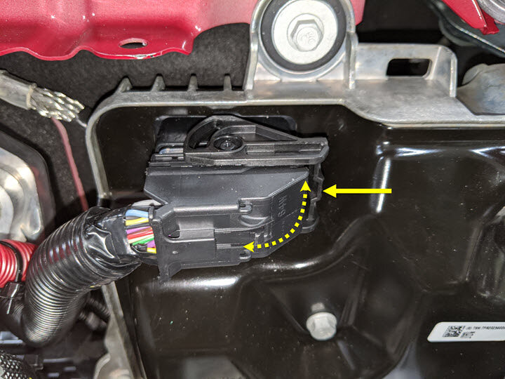 CAUTIONDO NOT push down on the red locking tab. Pull the tab away from the connector until the connector is unlocked, and then continue pulling the main body of the connector to fully disconnect it.
