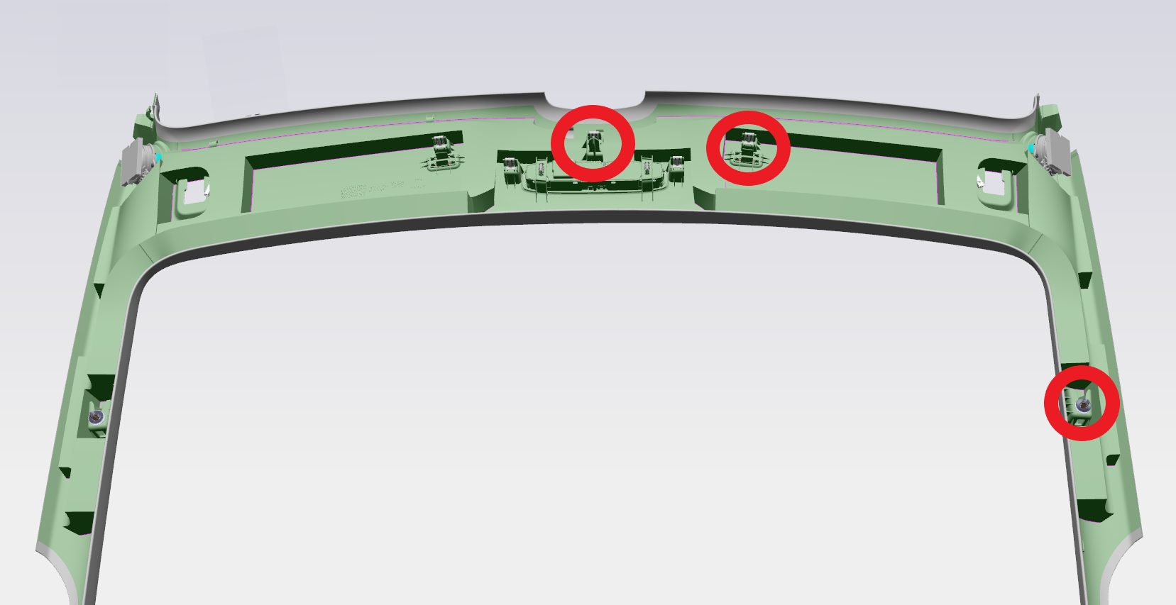 Fasten the clips (x3) that attach the front of the front headliner to the body.