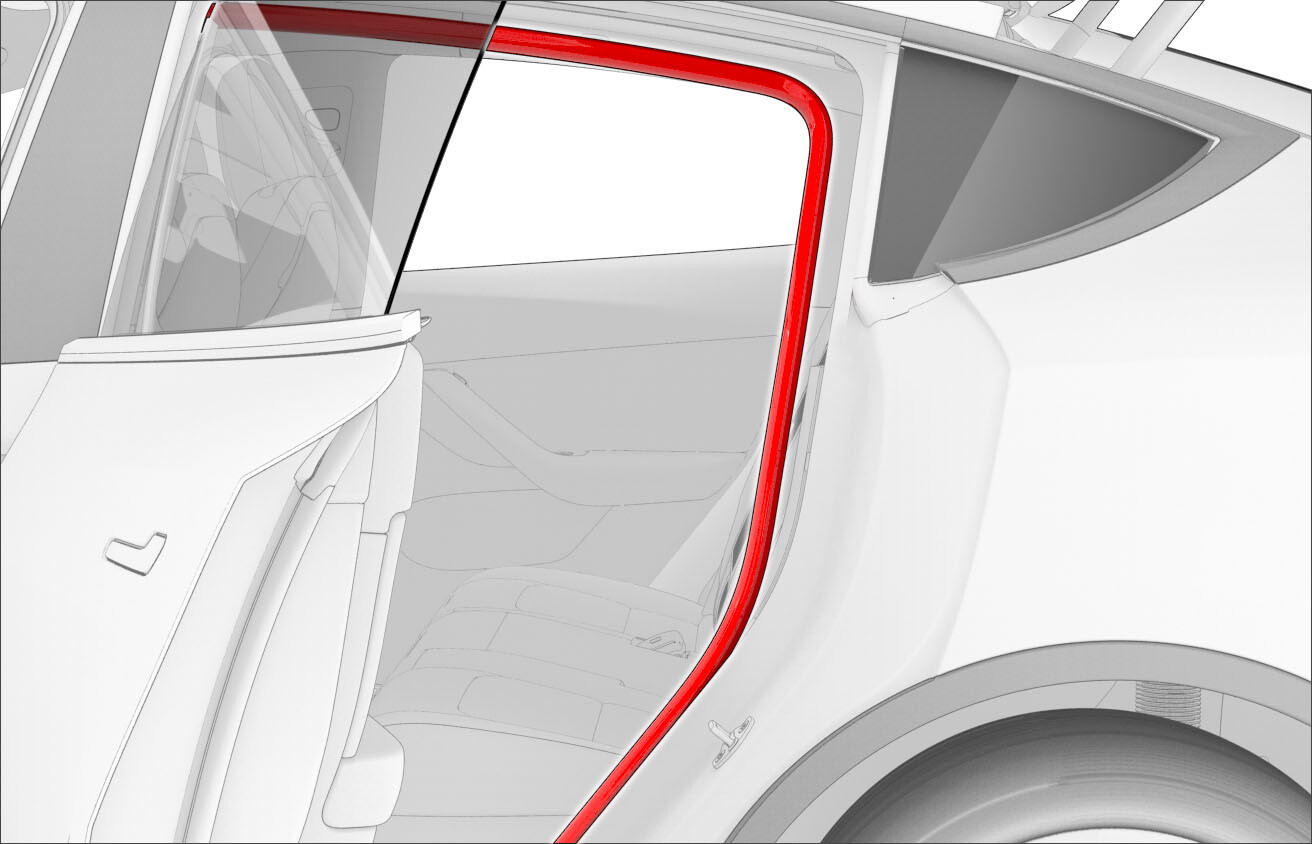 NoteMake sure the LH rear door primary seal fits over the upper brightwork, LH rear quarter glass seal, and all interior trim.