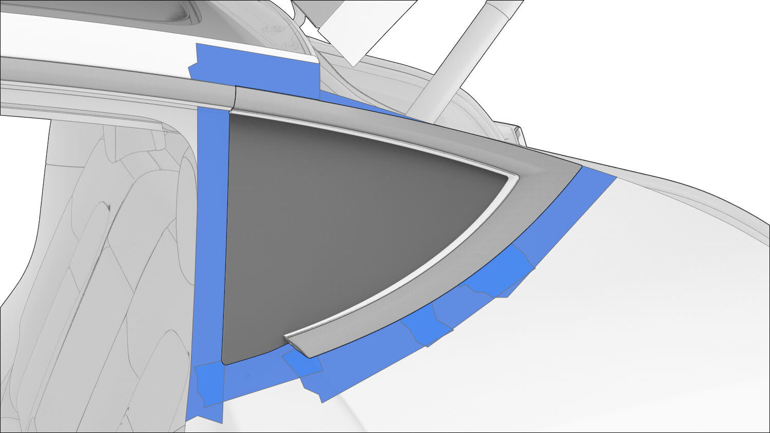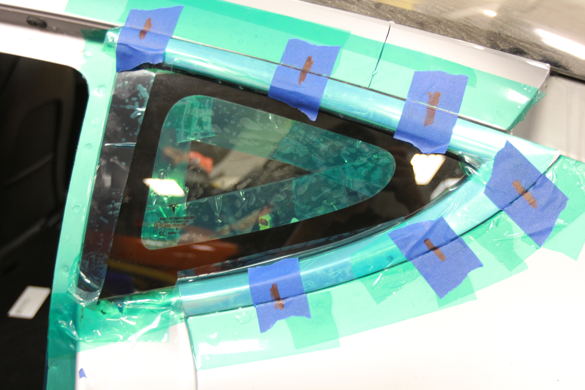 - Use tape to secure the LH rear quarter body glass to the body while the urethane cures.