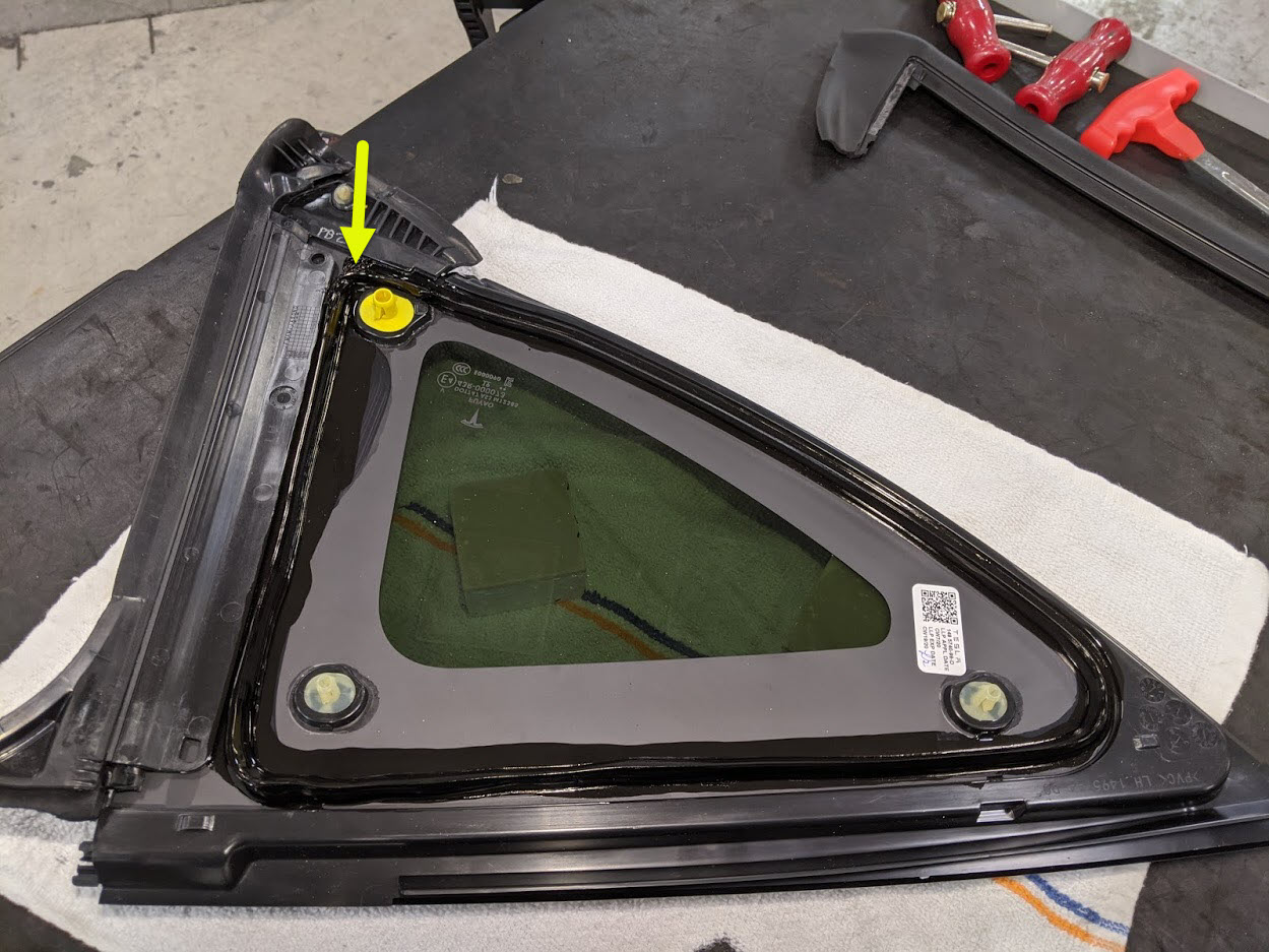 Cut down the rubber seal around the LH rear quarter glass to allow more
